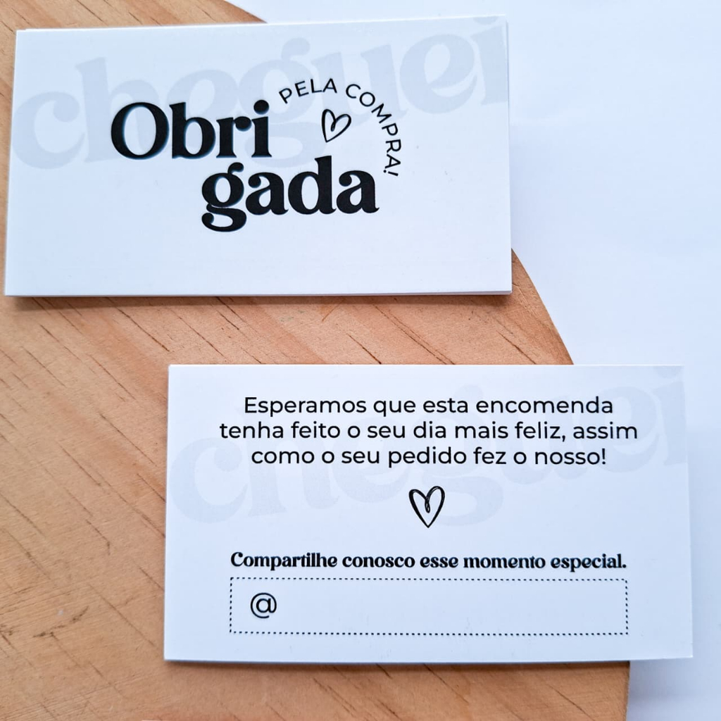 Mini Cartão de Agradecimento pela Compra – Pronto para Uso IMPORTANTE: Este produto NÃO permite personalização, alteração de cores ou adição de elementos. 💡 Aumente o valor percebido dos seus produtos! Surpreenda seus clientes e fortaleça sua marca com nossos cartões de agradecimento exclusivos. Criados com design elegante e mensagem cativante, eles ajudam a criar conexão e transmitir profissionalismo desde o primeiro contato. ✨ Vantagens de usar nossos cartões: - Transmitem mais valor e cuidado com seu produto. - Criam um vínculo positivo com seu cliente. - Incentivam novas compras. - Aumentam as chances de divulgação nas redes sociais. 📋 Especificações: Quantidade: 50, 100 ou 200 unidades Tamanho: 9x5cm Material: Papel C2S 300g Impressão: Digital de alta definição Opções de cores: • 4/4 – Frente e verso coloridos Modelo BRANCO ou ROSA TROPICAL Verso com espaço livre para escrever rede social manualmente. 🚚 Prazo de postagem: Envio rápido, em até 24 horas úteis após a confirmação do pedido. 💼 Pronto para uso e ideal para negócios que querem encantar e fidelizar clientes! OBSERVAÇÕES IMPORTANTES Lembrando que por se tratar de um processo de impressão, pode existir variação de até 15% na cor para mais claro ou mais escuro.