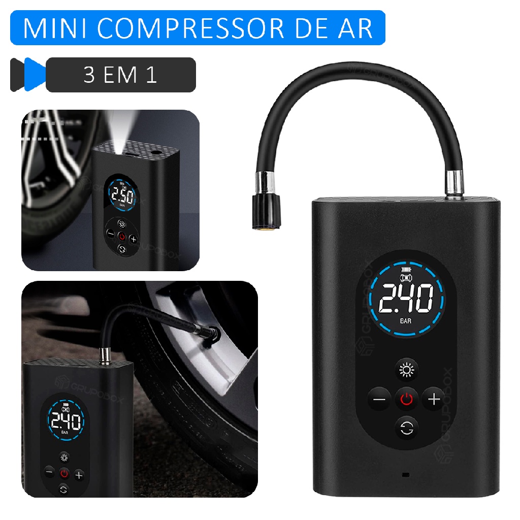Mini Compressor de Ar Portátil De Pneu Digital Calibrador Bomba 12V Carro Portatil e Power Bank