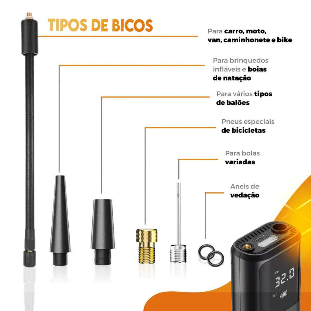 Conheça o CALIBRADOR PORTÁTIL DE PNEUS E INFLÁVEIS, sua solução ideal para manter a pressão adequada de seus pneus e infláveis de forma rápida e eficiente. Além de calibrador, este dispositivo inovador serve como POWERBANK, tornando-se indispensável em situações de emergência. Compacto e fácil de transportar, é perfeito para uso em viagens, acampamentos ou como um item essencial no seu carro. Este calibrador inteligente oferece ajuste automático de pressão com modos pré-programados para diferentes tipos de pneus e infláveis, garantindo a inflação ideal ao toque de um botão. A tela de exibição digital fornece leituras precisas em PSI, BAR, KPA, ou KG/cm², facilitando o monitoramento durante o uso. Sua eficiência é notável, sendo capaz de calibrar uma bola em apenas 30 segundos e um pneu de bicicleta em um minuto. Esse calibrador não apenas otimiza seu tempo, mas também assegura que você e sua família estejam sempre seguros em suas jornadas." LANTERNA INCORPORADA: Para maior comodidade e segurança, útil em situações de emergência ou locais com pouca iluminação. 1x Clique: Luz Branca (luz de emergência) 2x Clique: Luz Vermelha intermitente lenta (luz de sinalização) 3x Clique: Luz Vermelha intermitente rápida (luz de sinalização) INTERFACE DE CARREGAMENTO RÁPIDO: Cabo USB - Type C incluso para recargas mais eficientes POWERBANK: Além de calibrador, este dispositivo também funciona como powerbank, ideal para recargas rápidas de seu celular. ESPECIFICAÇÕES: 13,7cm x 8.9cm x 4,8cm 395g Bateria: 4000mAh (2*2000mAh) Material: ABS Potência: 50w Voltagem: 7.4v Fluxo de pressão de ar: 40l/Minuto ITENS EMBALAGEM: 1 – Calibrador elétrico 4000mAh 1 – Cabo usb-c 1 – Bico para pneus carro, moto, vans e camionetes 1 – Bico para bicicletas normais e especiais 1 – Bico para bolas e balões 1 – Bico para infláveis 1 – Tubo flexível ------------------- Atendimento e suporte: Nossa equipe está disponível para tirar suas dúvidas antes, durante e após o processo de compra. Conte conosco para uma experiência tranquila e satisfatória. Garantia: Todos os nossos produtos são acompanhados de garantia, proporcionando a você tranquilidade e segurança em suas compras. -------------------