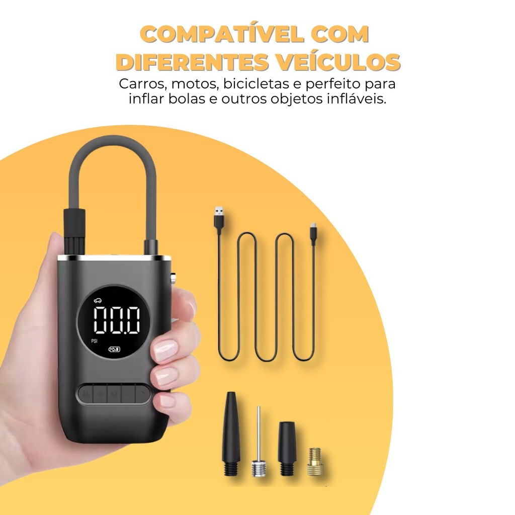 Mini Compressor Digital Tippi Bomba De Encher Pneus Bola Portátil Para Motocicletas Carro Bicicleta Preto Com Calibrador A Bomba de Ar Elétrica Portátil é a solução perfeita para quem busca praticidade, potência e segurança em diversas situações. Com um design compacto e leve, ela pode ser facilmente transportada para qualquer lugar, permitindo inflar rapidamente pneus de bicicleta, carro, moto, bolas, boias, colchões infláveis e muito mais. Equipada com uma bateria de 4000mAh e tecnologia sem fio, oferece autonomia prolongada e pode ser recarregada via USB Tipo-C, eliminando a necessidade de cabos longos ou conectores veiculares. Seu fluxo de ar de 25L/min garante um enchimento rápido e eficiente, enquanto a função de ajuste automático de pressão permite selecionar valores em PSI, BAR, KPA e kg/cm², interrompendo o fluxo ao atingir a pressão desejada. Além disso, conta com uma luz LED de emergência, ideal para situações noturnas. Compacta, versátil e fácil de usar, essa bomba de ar é indispensável para quem busca conveniência e eficiência no dia a dia. Especificações Técnicas: • Material: ABS • Corrente: 10A • Voltagem: 7,4V • Potência: 50W • Fluxo de Pressão de Ar: 25L/min • Bateria: 4000mAh recarregável via USB Tipo-C • Modos de pressão: PSI, BAR, KPA, kg/cm² • Luz LED de emergência: Sim Dimensões: • Comprimento do Cabo USB: 0,8m • Comprimento do Tubo Inflável: 0,5m • Tamanho do Compressor: 95 x 72 x 150 mm FAQ – Perguntas Frequentes: 1. A bomba pode ser usada para inflar pneus de carros? Sim, ela pode inflar pneus de carro, moto, bicicleta e diversos infláveis. O tempo médio de inflação é de 8 minutos por pneu de carro. 2. Quanto tempo leva para carregar totalmente a bateria? O tempo de carregamento completo via USB Tipo-C é de aproximadamente 3 a 4 horas. 3. O compressor desliga automaticamente ao atingir a pressão desejada? Sim! Basta configurar a pressão desejada, e a bomba desliga automaticamente ao atingi-la. 4. A bomba pode ser usada enquanto está carregando? Não é recomendado utilizá-la durante o carregamento para evitar superaquecimento e garantir maior durabilidade. Conteúdo da Embalagem: • 01 Mini Compressor de Ar • 01 Cabo USB de Carregamento • 01 Mangueira para Pneus • 01 Agulha para Bolas • 01 Bocal para Boias e Brinquedos Infláveis Importante: Valor Unitário Imagens Meramente Ilustrativas Não nos responsabilizamos pelo mau uso do produto