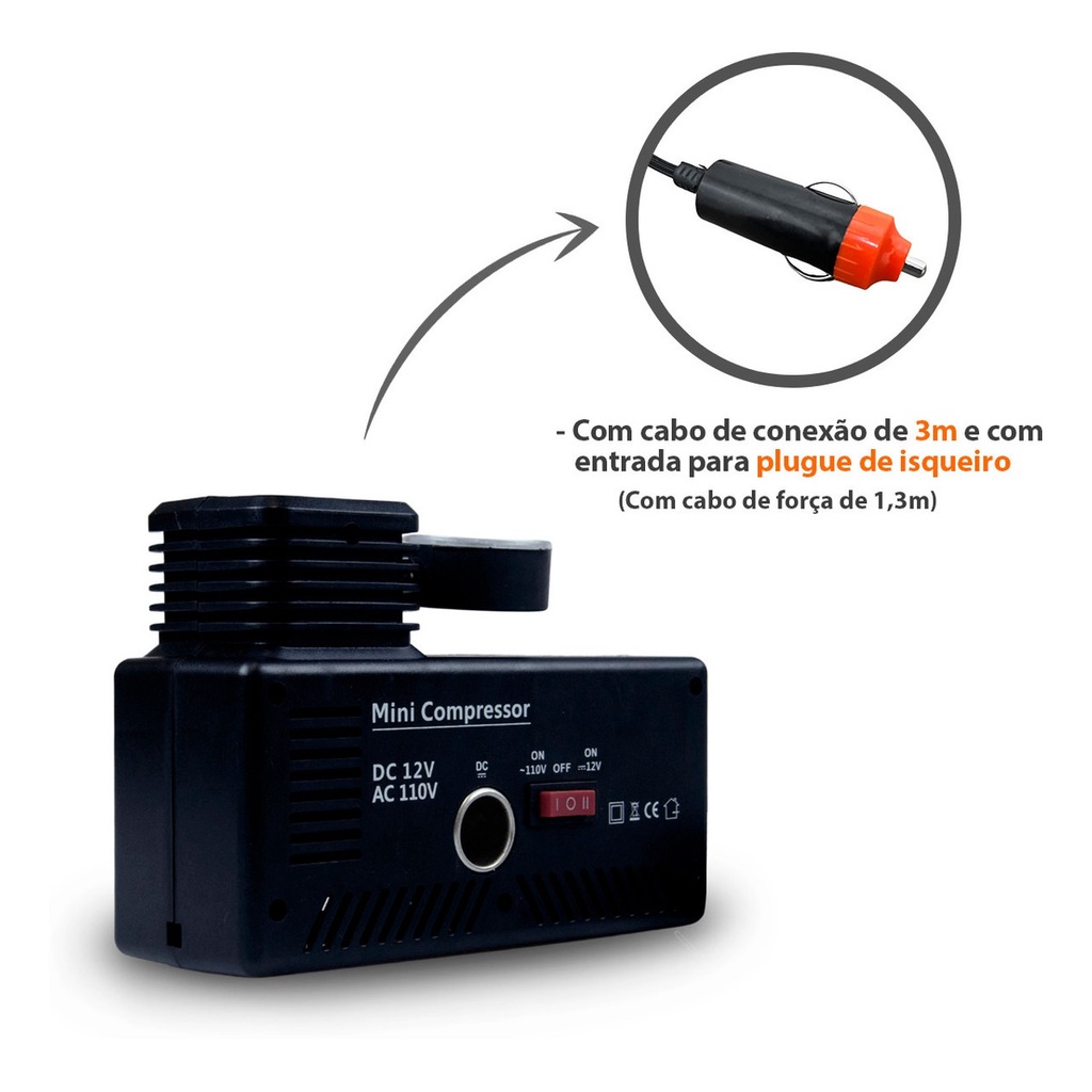 Descrição Mini Compressor De Ar Automotivo 300PSI: Conheça agora o incrível Mini Compressor De Ar Automotivo 300PSI da Importway, ele é uma ferramenta projetada para garantir que você nunca mais sofrera nenhum problema com seus pneus novamente, com sua bomba de carga e seus 3 bicos adaptadores você terá a facilidade de resolver todos os problemas de pressão de ar tornando esta ferramenta perfeita para encher qualquer pneu de seus veiculo economizando seu tempo e obtendo um resultado de qualidade. Especificações Técnicas: - Marca: Importway - Modelo: IWMCA30030-02 - Voltagem: 12V/220V - Pressão Máxima: 300psi - Fluxo de Ar: 30L/min - Mangueira de Ar: 45cm - Possui 4 Bicos Adaptadores - Cabo de Alimentação: 3 metros - Cabo conecta no acendedor de cigarro do veículo. Conteudo da embalagem: - 01 Mini Compressor De Ar Automotivo 300PSI - 04 Bicos Adaptadores Importante: Garantia de 12 meses. A Auto Equip recomenda que a instalação seja feita por profissional especializado e não se responsabiliza pelo mau uso do produto.