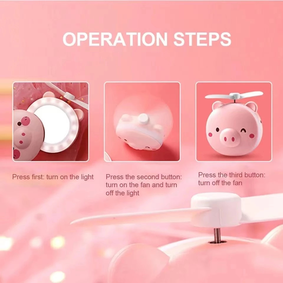 Mini Espelho Ventilador Porquinho Rosa Usb Iluminação Luz Led Para Maquiagem Portátil