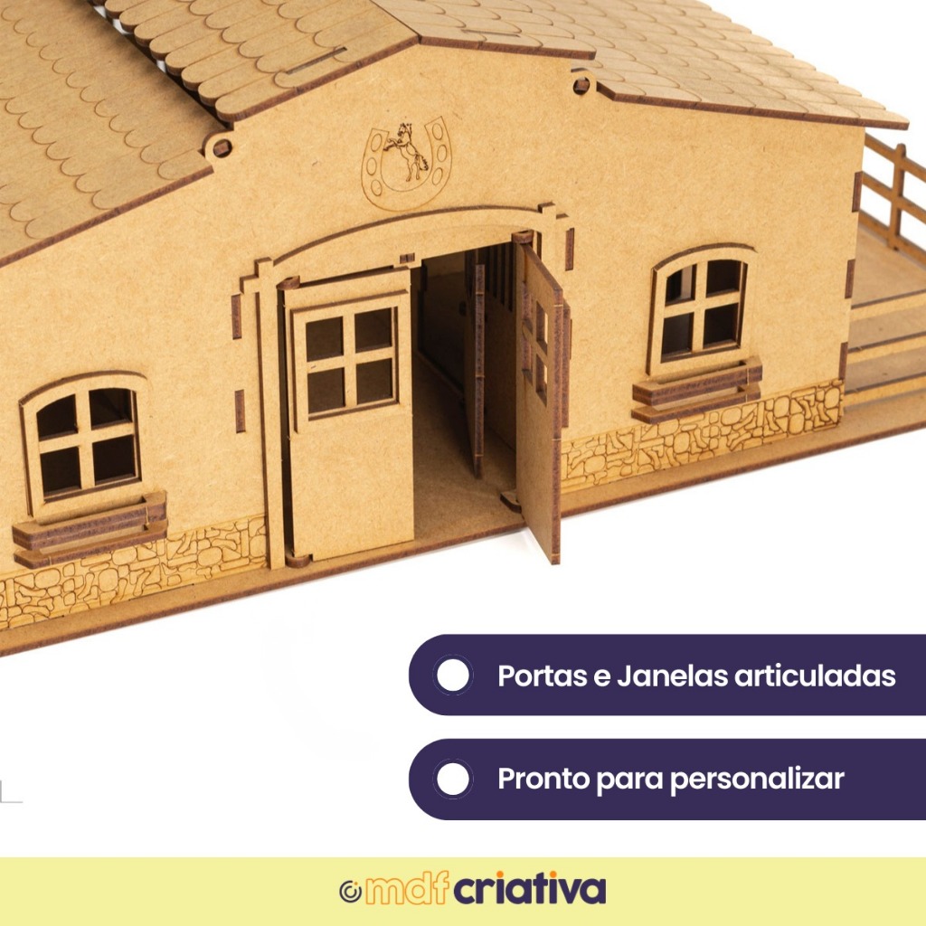 Vamos reviver a infância e sonhar? O Mini Estábulo em MDF é um presente perfeito para você compartilhar de um tempo de qualidade construindo e criando cenários com seus filhos, sobrinhos, afilhado etc. Medidas: Altura: 18 cm Largura: 58 cm Comprimento/profundidade: 38 cm Altura das portas do cercado: 9 cm Altura das portas da frente: 10 cm Escala aproximada: 1:20 Espessura 2,5mm ATENÇÃO: NÃO ACOMPANHA COLA. Pode ser usado cola branca PVA, tek bond ou cola de madeira Observações: - O Mini Estábulo é enviado totalmente desmontado; - Para a montagem é necessário uso de cola, recomendamos cola branca PVA (não incluso) - Enviamos link do vídeo de montagem junto com o produto ou enviamos nas mensagens após a compra caso precise; - Indicado para bonecos com máximo de 8cm de altura.