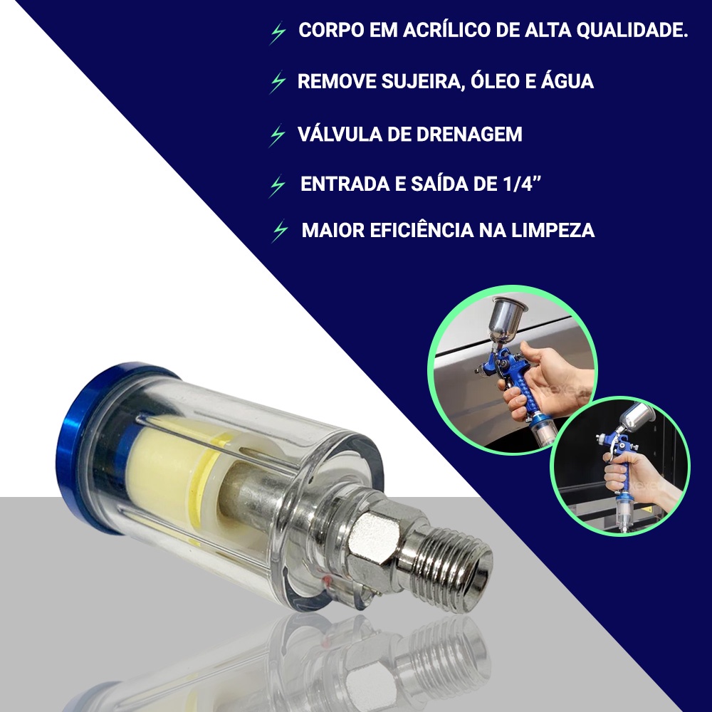 O Mini Filtro de Ar para pistola de pintura, é o componente certo para acabamentos de pinturas de alto padrão, uma ferramenta prática que trará facilidade na hora da pintura em superfícies em geral. Marca: Leminos Características: - Corpo em acrílico de alta qualidade - Rosca 1/4" macho (Entrada de Ar) - 1/4” Fêmea (Conexão da Pistola) - Indicado para pistolas de pintura - Válvula para drenagem de água prática e rápida - Pode ser usado ligado diretamente na pistola de pintura ou no compressor de ar. - Pressão Máxima: 150psi - Capacidade de vazão: 350 L/min - Grau de filtragem: 10 um - Indicado para Filtragem fina de umidade do sistema de ar - Utilizado em acabamento de pinturas de alto padrão - Uso Semiprofissional e Profissional. Conteúdo: - 1 Mini filtro de Ar Aplicação: Esse equipamento foi desenvolvido para remover o ar produzido pelo compressor, partículas de poeiras, água e óleo. Indicado para acabamentos de pinturas de alto padrão. Código: BC041 PERGUNTAS FREQUENTES PRONTO ENTREGA: Sim ENVIAMOS PARA TODO BRASIL EM ATÉ 24H ÚTEIS: Sim COM NOTA FISCAL: Sim FOTOS REAIS: Sim TROCA OU DEVOLUÇÃO ATÉ 30 DIAS: Sim EMITIMOS NOTA PARA PJ: Sim