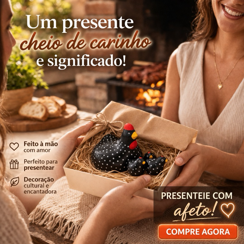 🐔✨ Mini Galinha de Barro – Presente Afetivo e Decoração Encantadora Encante, surpreenda e transforme qualquer ambiente com esse lindo kit mini galinha de barro artesanal 💛 Feito com carinho em cada detalhe, esse conjunto é perfeito para quem busca um presente criativo, afetivo e cheio de significado ou até mesmo uma decoração rústica e charmosa para sua casa. ⸻ 🎁 Perfeito para presentear Um presente que vai além do comum! Ideal para: ✔ Dia das Mães ✔ Aniversários ✔ Lembrancinhas especiais ✔ Presentes afetivos ✔ Clientes e amigos ⸻ 🏡 Decoração que encanta Combina perfeitamente com: ✔ Área gourmet 🍖 ✔ Cozinha rústica ✔ Estantes decorativas ✔ Mesas e cantinhos especiais Traz um toque acolhedor, cultural e artesanal ao ambiente. ⸻ 🖐️ Produto artesanal feito à mão ✔ Produzido em barro de alta qualidade ✔ Pintura 100% manual ✔ Cada peça é única e exclusiva 💡 Por ser um produto artesanal, podem ocorrer pequenas variações de cor e acabamento — o que torna cada peça ainda mais especial! ⸻ 📦 O que você recebe: ✔ 1 Galinha maior ✔ 2 Mini pintinhos ✔ Base decorativa (palha/apoio) ⸻ ❤️ Por que escolher esse produto? ✔ Presente fácil e encantador ✔ Alto valor emocional ✔ Produto diferenciado (não é comum) ✔ Artesanal e cultural ✔ Ótimo para revenda e decoração ⸻ ⚡ Garanta o seu agora! Leve mais charme, carinho e personalidade para sua casa ou surpreenda alguém especial 🎁 👉 Clique em Comprar Agora e receba esse mimo encantador!
