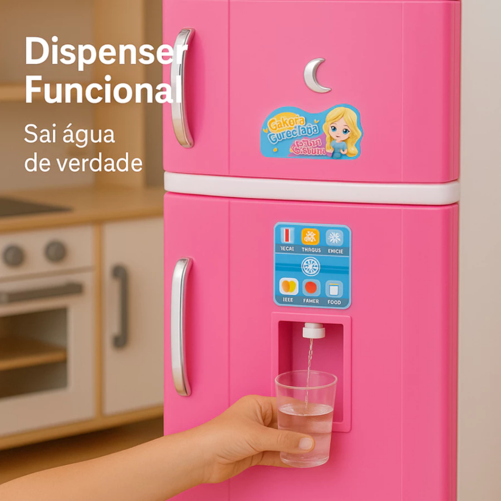 Mini Geladeira Duplex Tema Princesa Infantil Rosa para Brincar com Água Real e com Portas que Abrem