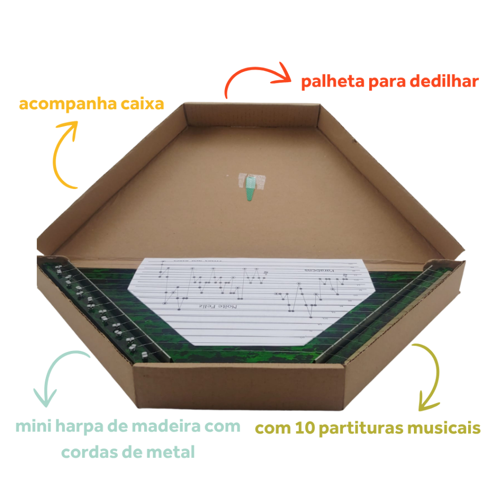 Cítara Mini Harpa A Cítara Mini Harpa é um instrumento musical encantador que aproxima as crianças do mundo da música de forma lúdica e educativa. Produzida artesanalmente em madeira resistente, com 15 cordas metálicas, ela estimula a coordenação, a percepção auditiva e o senso rítmico, desenvolvendo a sensibilidade musical desde cedo. Basta dedilhar as notas indicadas nas partituras que acompanham o instrumento para tocar melodias simples e divertidas! Ideal para introduzir o aprendizado musical de maneira prática e prazerosa, a Cítara ajuda a despertar o interesse das crianças pela arte, além de incentivar a concentração e a criatividade. Disponível nas cores verde, vermelho ou azul, é perfeita para escolas, aulas de música e momentos de aprendizado em família. Contém: 1 Cítara Mini Harpa com 15 cordas metálicas 10 partituras musicais 1 palheta para dedilhar Material: Madeira e metal Cores: Verde, vermelho ou azul (variam conforme o lote) Idade recomendada: A partir de 6 anos Medidas da harpa: 22 x 26 x 3 cm Medidas da caixa: 24 x 60 x 6 cm Medidas da partitura: 31 x 21,5 cm Benefícios pedagógicos: Coordenação motora fina e auditiva – desenvolve o controle das mãos e a percepção de sons. Sensibilidade musical – introduz ritmo, melodia e harmonia de forma divertida. Concentração e atenção – estimula o foco ao acompanhar as partituras. Criatividade e expressão artística – incentiva a descoberta musical e a autoconfiança. Percepção visual e memória – aprimora o reconhecimento de notas e padrões musicais. PRODUTO ARTESANAL – SUJEITO A VARIAÇÕES DE COR E TEXTURA. Imagens meramente ilustrativas.