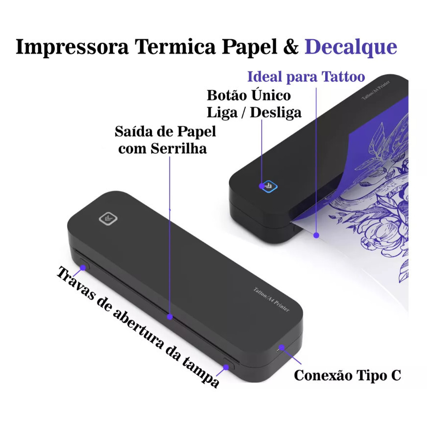 Tattoo Decalque Printer A4 Impressora Térmica 203DPI Skin-88 Bluetooth A impressora mp-8028 Térmica A4 te permite a impressão de decalques para tattoo, fotos, documentos, notas fiscais e adesivos com extrema qualidade, facilidade de conexão seja por tablet, celular ou computador. Graças a tecnologia de impressão térmica, nenhuma tinta é necessária, produto portátil devido sua bateria de alta capacidade. A impressora mp8028 A4 é ideal para utilização em qualquer lugar possui bateria interna DURÁVEL: Bateria de íon de lítio de 2000mAh, podendo ser carregada em qualquer carregador celular ou USB, com cabo original da impressora. Impressões Térmicas de qualidade, basta utilizar o rolo de papel térmico, adesivo térmico ou papel Stencil carbonado neste caso para decalques de Tatuagem. Informações: Modelo: mp-8028 Impressão Método: térmica. Tipo do papel: papel térmico. Aplicação: casa, escritório, loja. Tamanho do produto: Aproximadamente 265mm * 80cm * 48 cm Imprimindo a velocidade: 15 mm/s. Vida útil: Pode imprimir aproximadamente 50 km. Max. Resolução: 203dpi. Interface: Tipo C USB, Bluetooth 5.0 Tamanho máximo do papel: 50-216mm (largura). Bateria: 2600mAh. Nome do APP: **tattoo print*** Pode ser conectado a um computador para impressão Conecte-se a impressora via APP por Bluetooth no telefone, ligue Bluetooth no seu celular ou tablet e vá para APP DP-8028-EB76 dispositivo de impressora e conectá-lo. Conecte a impressora pelo computador utilizando cabo de dados USB que acompanha a sua impressora, basta plugar o cabo de dados com o computador, a seguir instale a o programa que vai no pendrive ao computador e conecte com a impressora. Para melhor qualidade de impressão, recomenda-se usar papel de qualidade produto que temos em nossa loja. Utilize sempre o cabo original para recarga da sua impressora, a garantia não cobre a utilização de outros cabos. Impressora pode ser carregada em qualquer dispositivo 5V e 2A, carregador de celular ou porta USB de qualquer dispositivo eletrônico com estas características. * A cabeça de impressão da impressora precisa ser limpa com algodão álcool etílico após o uso por um período de tempo. ⚠️🔥⚠️🔥⚠️especificações introdução⚠️🔥⚠️🔥⚠️ Conjunto-1: 1 x impressora 1 x rolo de papel A4 1 x Cabo USB para carregamento 10 x folhas para impressão de tatuagens(210*300mm) Conjunto-2: 1 x impressora 1 x rolo de papel A4 1 x Cabo USB para carregamento 10 x folhas para impressão de tatuagens(210*300mm) 100 x esculturas impressionantes (50*130mm) Conjunto-3: 1 x impressora 1 x rolo de papel A4 1 x Cabo USB para carregamento 110 x folhas para impressão de tatuagens(210*300mm) Conjunto-4: 1 x impressora 1 x rolo de papel A4 1 x Cabo USB para carregamento 110 x folhas para impressão de tatuagens(210*300mm) 100 x esculturas impressionantes (50*130mm)
