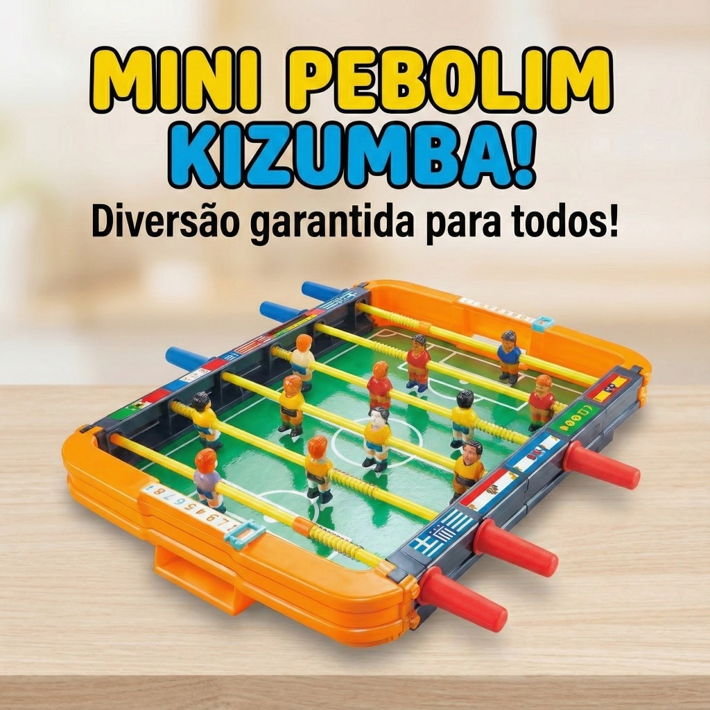Mini Jogo de Futebol Totó Jogos Pebolim Futebol de Mesa Grande Brinquedos Presente Meninm Kizumba O Mini Pebolim Totó Futebol de Mesa é a escolha perfeita para garantir diversão sem sair de casa! Compacto, leve e fácil de transportar, ele permite organizar partidas e campeonatos entre amigos em qualquer lugar seja em viagens, encontros de fim de semana ou momentos de lazer. Produzido em plástico PVC resistente, oferece durabilidade, estabilidade e excelente experiência de jogo. Conta com marcador de pontuação em ambos os lados, jogadores pintados e duas bolas em escala oficial, proporcionando partidas cheias de emoção para crianças e adultos. Especificações Técnicas: • Modelo: Mini Pebolim / Futebol de Mesa Tradicional • Material: Plástico PVC resistente • Marcadores: 1 de cada lado para controle de pontuação • Jogadores: 12 jogadores em plástico injetado e pintados • Bolas: 2 bolas plásticas em escala oficial • Uso: Entretenimento infantil e adulto Dimensões: • Comprimento: 35 cm • Largura: 25 cm • Altura: 5 cm FAQ (Perguntas Frequentes): 1. O pebolim é resistente? Sim, é fabricado em PVC de alta durabilidade. 2. Ele é fácil de transportar? Sim, é leve e compacto, ideal para viagens e encontros com amigos. 3. Quantas pessoas podem jogar? Duas pessoas podem jogar ao mesmo tempo. 4. Acompanha as bolinhas? Sim, acompanha 2 bolinhas plásticas. Conteúdo da Embalagem: • 01 Futebol de Mesa • 02 Bolinhas Importante: Valor Unitário Imagens Meramente Ilustrativas Não nos responsabilizamos pelo mau uso do produto