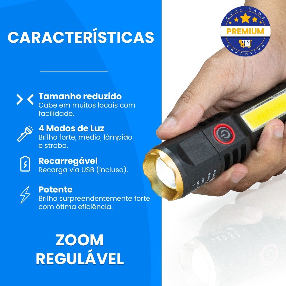 Não fique no escuro quando acabar a energia em sua casa. Esteja sempre preparado(a) com esta incrível Lanterna de mão. Com seus incríveis 4 modos de luz, sendo eles, luz forte, média, strobo, que irão atender todas as suas necessidades no momento em que mais precisar, além de ser possível utilizar o zoom regulável, que irá permitir iluminar locais mais distantes sem que seja necessário se aproximar. Adquira já a sua e esteja sempre preparado! ------------------ CARACTERÍSTICAS Fácil manuseio; Material durável e robusto; Fácil higienização; Possui regulagem de zoom, para facilitar a visualização de objetos que estão mais distantes; A lanterna com 4 modos de luz com modo intenso, luz média, strobo e modo lampião; Versatil já que pode ser utilizada como lampião; Seu design compacto e leve facilita o transporte, garantindo que você tenha uma fonte confiável de luz em qualquer lugar; Com seu poderoso alcance, a lanterna ilumina seu caminho mesmo em ambientes escuros ou distantes em até 20 metros; A lanterna pode ser recarregada facilmente através de um cabo USB, economizando tempo e dinheiro; Nunca mais seja pego desprevenido. O indicador de bateria informa o nível de carga, permitindo que você se planeje e evite ficar no escuro; Construída com materiais resistentes, essa lanterna é projetada para durar, fornecendo uma fonte confiável de luz por muito tempo. -------------- TAMANHO Dimensões aprox.: Tamanho aprox.: 13,5cm x 3,5cm. Peso aprox.: 61g. ------------------ DIFERENCIAIS De fácil uso, de fácil manuseio, material robusto e de qualidade, portátil, recarregável, material durável, potente e alta projeção de luz, zoom regulável. ------------------ ITENS INCLUSOS 1 - Lanterna. 1 - Cabo USB. ------------------ Aquisições realizadas até as 14h serão postadas no mesmo dia! ------------------ - GARANTIA 90 DIAS. ------------------ NÃO PERCA ESTA OPORTUNIDADE TEMOS POUCAS UNIDADES ! ------------------ ATENÇÃO: - A imagem do produto pode sofrer pequenas alterações no tom da cor de acordo com o dispositivo que está sendo exibido. - Dimensões medidas manualmente, o tamanho pode ter um desvio de 1-3 mm.