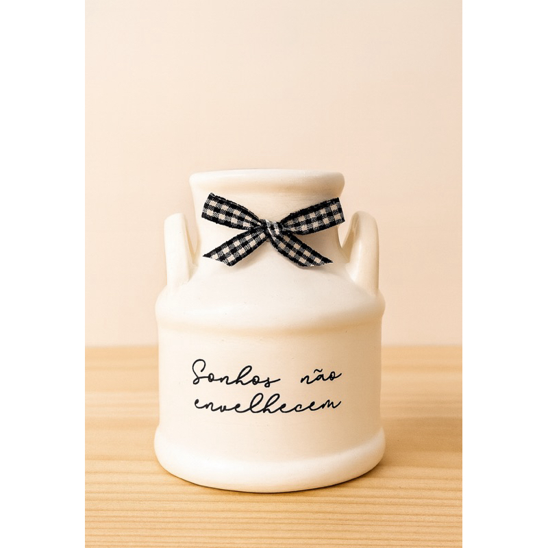 Olá, somos a GD Arts e estamos aqui para lhe oferecer a melhor experiência em compra. Sinta-se á vontade para tirar todas as suas dúvidas sobre nossos produtos, será um prazer atende-lo. Nossa loja conta com produtos 100% artesanais e feitos à mão, com detalhes que encantam. 1 Mini Leiteira Decorativa / Vaso decorativo Produzida em cerâmica, além de decoração, pode ser usada como vasinho para plantas artificiais. Estilo Farm House. Medidas Aproximadas: Altura: 10 cm Diâmetro : 5 cm ***OBS: Frases sortidas. Flor não está inclusa.