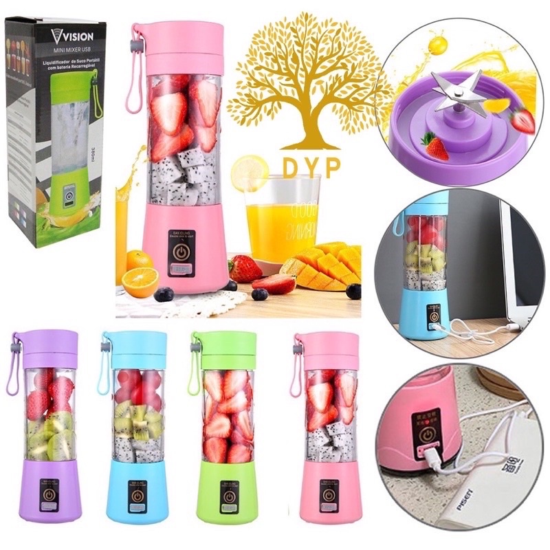 Mini Liquidificador Portátil Recarregável Portátil e com design revolucionário pode ser levado para academia, viagens e até mesmo ao escritório. A jarra é como um copo então você pode beber diretamente nela. Características do produto: * Tamanho compacto, portátil e multiuso * Bateria interna recarregável * Motor de alta velocidade * Seis lâminas para máxima eficiência * Coador integrado e alça de transporte * Utilize como um copo comum ou liquidificador * Segurança: dupla proteção de segurança e proteção de carga / descarga * Recarga e bateria através de porta Usb Especificações do produto: * Capacidade: 380 ml * Modelo do motor: 3,6 Vdc * Rotação do motor: Sem carga: < 22000 RPM / Carga: < 15000 RPM * Corrente de trabalho: 10 ~ 12 A * Bateria: 3,7 Vdc * Capacidade da bateria: 2000mAh * Alimentação: (mini USB V8) * Tempo de recarga: 3 horas aproximadamente * Único tempo de trabalho : 90 s * Proteção ociosa: Desliga em 5 s * Carga completa usando tempos: 10 ~ 12 vezes * Material da lâmina de corte: SUS304 * Material do copo: Poder do copo: PP, Corpo do copo: PC, Porta - copos e conectores: ABS, Anel de vedação: Silicone **Modelo de duas entradas o que muda? -A diferença do modelo de duas entradas é que o aparelho pode carregar outro aparelho também, em caso de urgência pode usar como carregador portátil que pode carregar o seu celular!!!** - Conteúdo da embalagem: 01 Mini Liquidificador 01 Cabo Usb (não acompanha fonte)