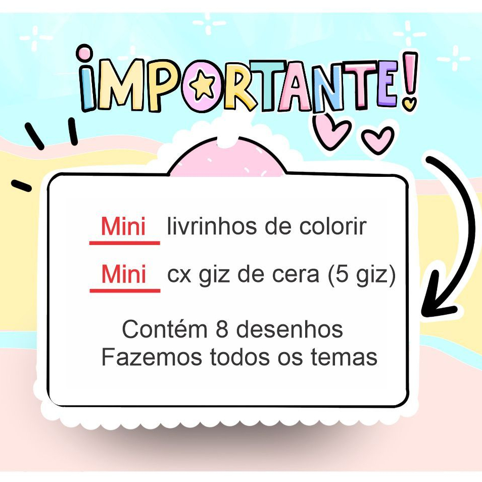 Medidas: Altura 14 cm Lateral 10,5 cm Contém 8 desenhos / 1 cx de giz de cera com 5 giz Personalizamos em todos os temas Produto é pequeno Papel utilizado oficio comum. Não enviamos arte para aprovação, alteramos o nome e idade do tema escolhido. Qualquer dúvida chame a gente no chat. Obrigada!