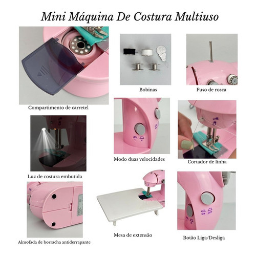 Mini Máquina de Costura Portátil Rosa Com Mesa e Pedal Bivolt Doméstica Com Mesa
