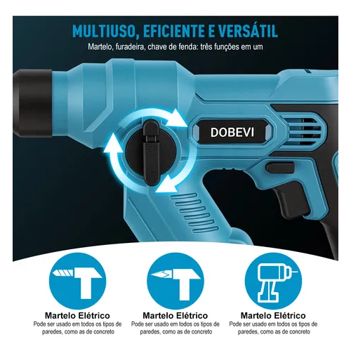 Furadeira e Martelo 2 em 1 Dobevi 12V com SDS-Plus de Impacto - 900 RPM Variável, Leve e Compacto para DIY Motor Potente: Compacto, Leve e de Fácil Manuseio: Com apenas 2,2 kg e um design corporal compacto, é ideal para trabalhos em altura, em espaços confinados ou para uso prolongado com os braços elevados. Reduz a fadiga dos braços e melhora a precisão de operação. Velocidade máxima de 900 RPM. O motor oferece potência excepcional, permitindo trabalhar com diversos materiais, incluindo concreto, metal e madeira. Controle de Velocidade Variável: Personalize a velocidade de perfuração usando o botão de controle de fácil ajuste, ideal para trabalhos de precisão de 0 a 900 RPM. Configuração com Duas Baterias, Trabalho Sem Interrupções: Inclui duas baterias de íon-lítio de 1,5Ah. Quando uma bateria descarrega, você pode substituí-la imediatamente pela bateria reserva para continuar trabalhando, enquanto a outra é carregada simultaneamente, permitindo um ciclo de trabalho praticamente ininterrupto. Multifuncional: Alterne facilmente entre perfuração e perfuração com impacto com um botão prático, personalizando sua ferramenta para as necessidades específicas do seu projeto. Sistema de Brocas SDS-Plus: Inclui 5 brocas SDS-Plus de alta qualidade para trocas rápidas e operação segura e eficiente. Este sistema minimiza a vibração e maximiza a produtividade. Design ergonômico: A estrutura compacta e a alça macia reduzem a fadiga e aumentam o conforto durante longos períodos de uso, tornando-a ideal tanto para projetos profissionais quanto para projetos de faça você mesmo. Especificações do Produto: Marca: DOBEVI Alimentação: Bateria Velocidade Máxima: 900 RPM Voltagem: 12 V (CA) Amperagem: 1,5 Ah Dimensões da Embalagem: 30*28*9cm Peso do Produto: 2,2KG Garantia do vendedor: 3 meses