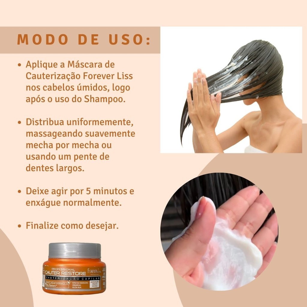A Mini Máscara Cauterização Capilar Forever Liss 40g foi desenvolvida para reparar a camada mais interna da fibra capilar dos fios danificados pela química. Com fórmula exclusiva que conta com complexo de Aminoácidos, tem ação antioxidante que previne o envelhecimento dos fios, além de ser rica em proteínas e vitaminas que repõe a massa perdida ao longo do tempo. Além disso, cria uma camada de proteção que previne novos danos aos cabelos, facilitando com que você curta o verão sem medo de ser feliz! Tem ação suavizante e disciplinante da cutícula capilar, o que resulta em fios macios, sedosos e com brilho extraordinário. Sua ação é termoativada. Indicação: Indicado para todos os tipos de cabelos, principalmentes os quimicamente tratados e danificados. Tecnologia: - Keratina Brasileira; - Cerâmidas; - Geleia real. Benefícios: - Reconstrução; - Reparação de danos; - Maciez e sedosidade; - Reposição de massa; - Brilho. Modo de uso: 01- Aplique a Máscara Forever Liss nos cabelos úmidos, logo após o uso do Shampoo. 02- Distribua uniformemente, massageando suavemente mecha por mecha ou usando um pente de dentes largos. 03- Deixe agir por 5 minutos e enxágue normalmente. 04- Finalize como desejar. Resultado: Cabelos revitalizados com maciez, leveza e brilho deslumbrantes; O resultado do produto pode variar de acordo com o estado e condições de cada tipo de cabelo. Contém 01 - Mini Máscara Cauterização Capilar Forever Liss 40g. Precauções: Manter em temperatura ambiente, em local seco e ao abrigo de luz. Uso externo adulto. Em caso de contato acidental com os olhos, enxaguar abundantemente. Havendo irritação, suspenda o uso. Caso a irritação persista, procure orientação médica. Não ingerir. Manter fora do alcance de crianças. Imagens meramente ilustrativas. Visualizações em mobile e desktop podem sofrer alterações de cor.