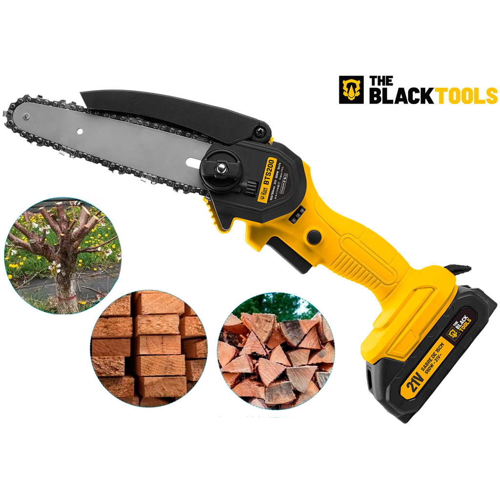Mini Serra Sabre a Bateria BTS200 – The Black Tools A Mini Serra Sabre a Bateria BTS200 da The Black Tools é uma excelente escolha para quem busca praticidade e eficiência em cortes de madeira e poda. Construída com materiais de alta qualidade, oferece facilidade de operação e ampla aplicação em jardinagem e carpintaria. Equipada com um motor de escova, garante partida rápida, frenagem segura e controle simples do circuito. Além disso, sua corrente passa por um processo de têmpera profunda em alta temperatura, resultando em maior durabilidade e cortes precisos. Vantagens: - Alto desempenho – Realiza cortes em madeiras de até 15 cm de diâmetro em apenas 10 segundos. - Ergonomia e segurança – Design compacto que facilita o manuseio e aumenta a eficiência. - Mobilidade sem fio – A bateria recarregável permite o uso sem necessidade de conexão à energia. Ideal para: - Corte de madeira, árvores, ramos e galhos. - Trabalhos de poda e jardinagem. - Uso doméstico e profissional. Especificações Técnicas: - Sabre: 150 mm - Bateria: 21V, recarregável - Velocidade da corrente: 5 m/s - Luz indicadora de bateria Itens Inclusos: - 01 Bateria 2.000 mAh - 01 Carregador Bivolt - 01 Recipiente óleo - 01 Corrente - 01 Sabre Cuidados e Recomendações: - Evite pressionar a ferramenta com força – Deixe a corrente realizar o corte de forma gradual. Marca: The Black Tools Modelo: BTS200