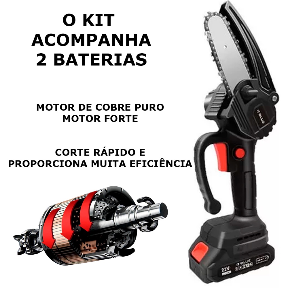 Mini Moto Serra Elétrica Recarregável 2 Baterias Para Poda E Corte Rápido Madeira Árvores 6Pol.