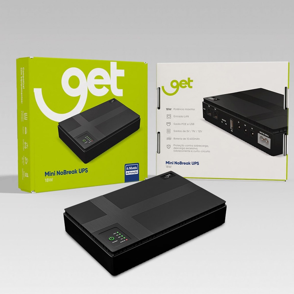 Mini No Break UPS Get: Conectividade e Proteção IninterruptaCompacto e eficiente, este equipamento é capaz de alimentar diversos dispositivos, como roteadores, modems, câmeras IP, switch, ONU/ONT e babá eletrônica, garantindo que seus dispositivos permaneçam ativos mesmo em caso de queda de energia elétrica.O Mini No Break UPS Get garante o melhor aproveitamento para seus modems ou roteadores, com sua compatibilidade e potência ideais para esses dispositivos, ele mantém a conexão à internet ativa, assegurando que você continue trabalhando, estudando ou aproveitando momentos de lazer sem interrupções.Com uma bateria de alta capacidade de 10.400 mAh e potência de 18W, ele também conta com quatro níveis de proteção que previnem danos causados por sobrecargas, curtos-circuitos e outros problemas elétricos, proporcionando mais segurança para os seus equipamentos.Totalmente bivolt, o Mini No Break é prático e adaptável a diferentes tensões, sem necessidade de ajustes manuais. Sua versatilidade é ampliada pela entrada LAN, saída POE e USB, permitindo conexões diversas para atender a diferentes necessidades.Seja em casa ou no escritório, o Mini No Break UPS Get é a solução ideal para manter seus dispositivos conectados e protegidos, garantindo que você não perca a conexão com o que realmente importa, mesmo durante uma queda de energia. Especificações Técnicas: Marca Get Modelo Mini Nobreak UPS GT 18W Bivolt 9/12/15/24V para Roteadores, modeMS, câmera de segurança Cor Preto Proteção Sobrecarga, descarga excessiva, sobrecorrente e curto-circuito Potência de saída máxima 18W Tensão de entrada Bivolt Entrada 85-265Vac/50-60Hz Saída USB 5V/2A, DC 5V/2A, DC 9V/1A, DC 12V/1A, POE 15V/0.6A, POE 24V/0.6A Temperatura de Operação -10ºC - 40ºC Umidade 10%-90%RH Quantidade e capacidade da bateria 10.400mAH Nível de proteção 4 LED indicador Sim Dimensões 16 x 10,5 x 3,3 cm Peso 0,4kg Conteúdo da Embalagem 1 Mini no Break, 1 Cabo de alimentação, 1 Cabo extensor DC, 1 Cabo extensor DC 2 em 1, 1 Manual de Instruções Garantia 12 meses com o fornecedor
