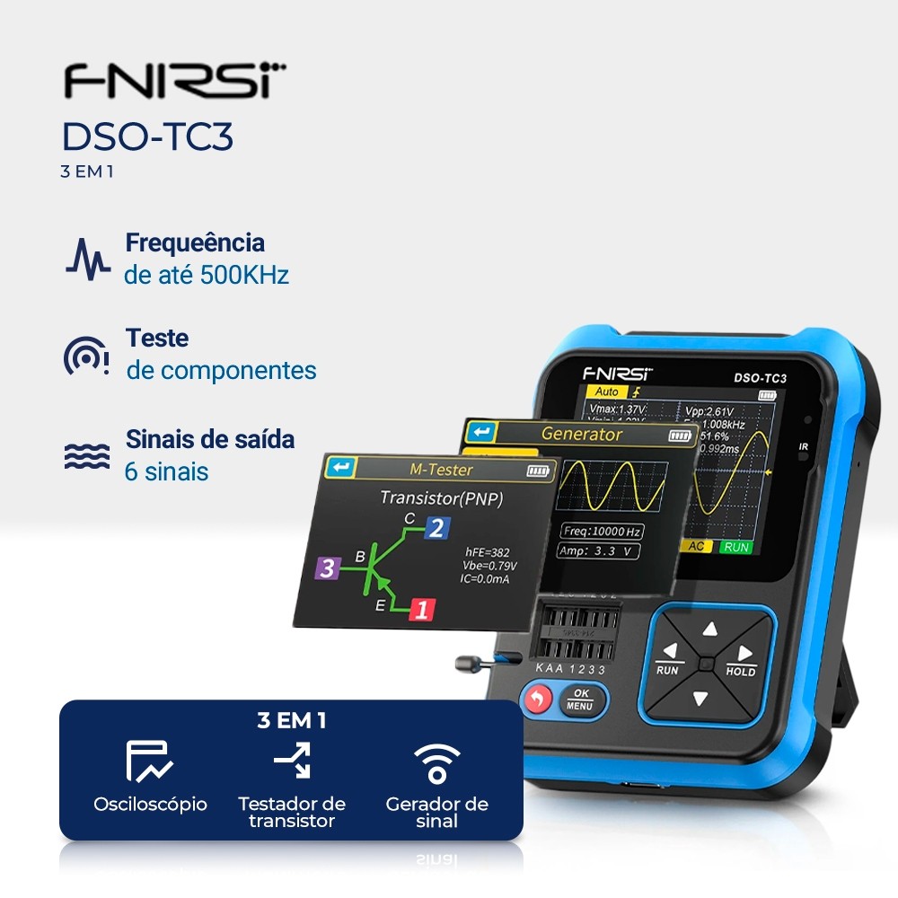 Mini Osciloscópio Digital FNIRSI DSO-TC3 Portátil O FNIRSI DSO-TC3 é uma ferramenta multifuncional 3 em 1, combinando osciloscópio digital, testador de transistores e gerador de sinais em um único dispositivo compacto. Ideal para técnicos, engenheiros e entusiastas da eletrônica, oferece alta precisão e praticidade para diagnóstico, reparo e desenvolvimento de circuitos. Com sua interface intuitiva e tela clara, o DSO-TC3 é a solução portátil perfeita para análises detalhadas de sinais e testes de componentes. Características Principais: Multifuncionalidade 3 em 1 Osciloscópio Digital: Analisa formas de onda e sinais elétricos com precisão Testador de Componentes: Mede e verifica transistores, diodos, resistores e capacitores Gerador de Sinal Integrado: Produz formas de onda padrão (seno, quadrado, triangular) para testes de circuitos Desempenho Técnico Avançado Largura de Banda de 500 kHz: Adequado para análise de sinais de baixa frequência Taxa de Amostragem de 10 MSa/s: Captura sinais com alta precisão e detalhes Sensibilidade Vertical de 10 mV/div a 10 V/div: Ideal para medição de sinais fracos e fortes Modos de Trigger: Auto, Normal e Single, para capturas específicas de eventos de sinal Medições e Testes Automáticos Medições Automáticas: Frequência, período, amplitude, valor médio e RMS Teste de Componentes: Mede resistências, capacitâncias e avalia transistores e diodos Interface e Exibição Tela LCD Colorida de 2,4": Exibe formas de onda e resultados de medição com clareza Interface Intuitiva: Navegação simples e botões bem posicionados para facilitar o uso Conectividade e Armazenamento Memória Interna: Permite salvar formas de onda e resultados de medições para análise posterior Interface USB: Para transferência de dados e carregamento da bateria Portabilidade e Alimentação Bateria Recarregável de Íons de Lítio: Garante autonomia prolongada para uso em campo ou laboratório Design Compacto e Leve: Facilita o transporte e o uso em locais de difícil acesso Aplicações Ideais: Reparos de dispositivos eletrônicos Desenvolvimento e testes de protótipos Diagnóstico de circuitos digitais e analógicos Uso em laboratórios educacionais e de pesquisa Especificações Técnicas: Largura de Banda: 500 kHz Taxa de Amostragem Máxima: 10 MSa/s Profundidade de Memória: 40 Kpts Canais: 1 Sensibilidade Vertical: 10 mV/div ~ 10 V/div Resolução Vertical: 8 Bits Intervalo de Tempo Base: 10 ns/div ~ 10 s/div Tensão Máxima de Entrada: 400 V Tela: LCD colorido de 2,4" Armazenamento Interno: Suporte para salvar formas de onda e resultados de medições Interface USB: Para transferência de dados e carregamento Alimentação: Bateria de íons de lítio recarregável integrada Conteúdo da Embalagem: 1x Cabo USB-C, 1x Cabo Teste de Circuito, 3x Gancho de Teste, 1x Manual do Usuário Garantia: 3 meses de garantia contra defeitos de fabricação Referência: OS012 O FNIRSI DSO-TC3 é a escolha ideal para quem busca uma ferramenta completa e portátil para medições e testes eletrônicos. Compacto, leve e repleto de funcionalidades, ele é perfeito para uso em campo ou em laboratório, atendendo às necessidades de profissionais e amadores.