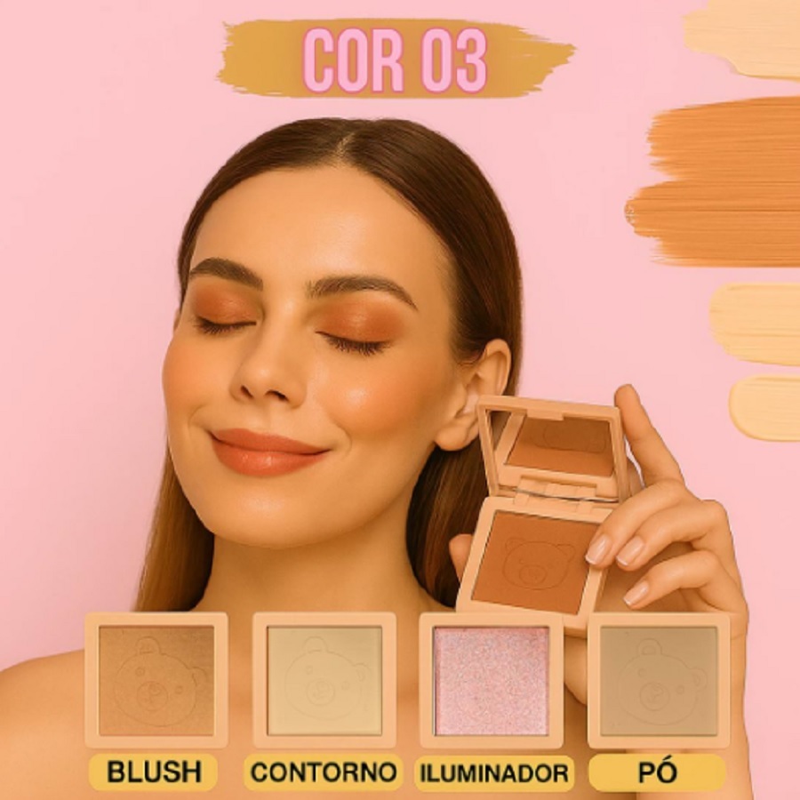 Mini Paleta de Bolsa 4 em 1 Lua & Neve — Blush + Contorno + Iluminador + Pó Compacto com Espelhinho Indicações Cores: 1 - Pele Claras Brancas 2 - Bege Claro 3 - Bege Natural 4 - Bege Médio Leve beleza e praticidade para qualquer lugar com a Mini Paleta de Bolsa 4 em 1 Lua & Neve! Compacta, charmosa e super funcional, ela reúne tudo o que você precisa para uma make completa em um único estojo — perfeita para retoques rápidos no dia a dia ou para levar na bolsa durante viagens. Contém 4 camadas incríveis: Blush: proporciona um toque saudável e natural às maçãs do rosto; Contorno: ideal para definir e realçar seus traços com sutileza; Iluminador: garante aquele brilho radiante e sofisticado; Pó compacto: ajuda a selar a maquiagem e controlar o brilho da pele. Destaque: acompanha espelhinho embutido, tornando o uso ainda mais prático e elegante. Indicação de tons: Com sua combinação equilibrada de cores, a paleta se adapta a diversos tons de pele, desde as mais claras até as morenas médias. O iluminador e o contorno têm pigmentação versátil, realçando a beleza natural de cada tom com acabamento aveludado e uniforme. Design Fofo e Compacto: Com embalagem retrátil e estampa de ursinho, é perfeita para quem ama produtos funcionais, delicados e colecionáveis. Perfeita para: Levar na bolsa, mochila ou nécessaire Retocar a make em festas, viagens e no dia a dia Presentear quem ama maquiagem e praticidade