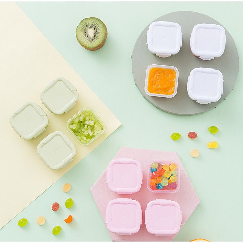Mini Potes armazenamento infantil 4 peças em cores sortidas. Para mantimentos infantil, frutas ,legumes, doces para levar em viagens. ANTIVAZAMENTO MEDIDAS; -GRANDE: 6,5 x 8 x 5 cm -PEQUENO: 5 x 6 x 4 cm Cor: Multicolorido