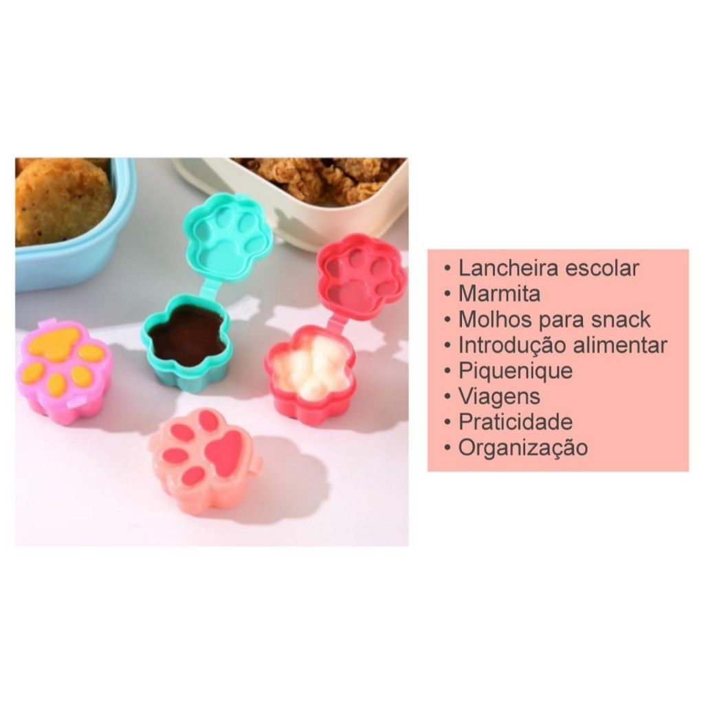 ESTOQUE DISPONÍVEL! ENVIO IMEDIATO!!! - Kit composto por: 04 Mini Potes Temas: Patinhas - Dimensões: A: 2,0cm x L: 3,5cm x C: 3,5cm Bichinhos - Dimensões: A: 2,0cm x L: 3,5cm Rainbow - Dimensões: A: 2,0cm x L: 3,5cm x C: 3,5cm Capacidade: 10 ml Material: Plástico IMPORTANTE: Escolher o modelo que mais lhe agradar, no momento da compra. Se você gosta de produtos diferenciados, design inovador e sempre surpreender, você acaba de encontrar um kit encantador. Os mini potes são lindos e encantadores! Você poderá utilizá-los em diversas ocasiões: Lancheiras infantis, Molhos para salada para levar ao trabalho, Potinhos fofos em piqueniques, Lanches divertidos para as crianças, Lembrancinhas em festas e muitas possibilidades. Podem ser utilizados para: Maionese, mostarda, ketchup, molhos cremosos, Nutella, Mel, Leite condensado, etc. Para lancheiras saudáveis é uma excelente opção! As crianças poderão se alimentar de uma forma nutritiva e muito divertida! Agora é só deixar a imaginação fluir e tornar os momentos muito mais alegres e saborosos!