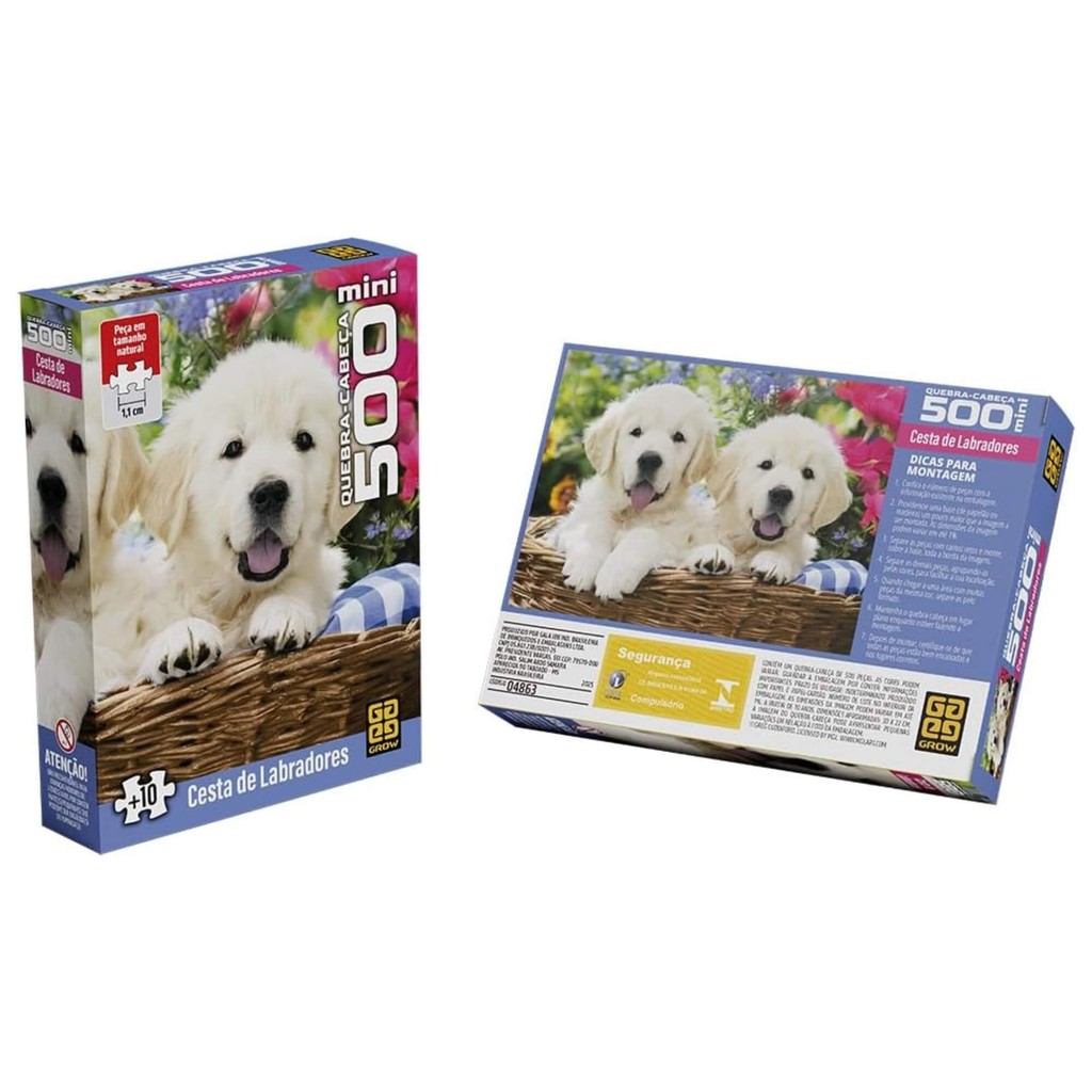 Se você ama cachorros e desafios divertidos, este quebra-cabeça é feito para você! A imagem fofa de dois filhotes labradores em uma cesta encantadora vai derreter seu coração enquanto você monta cada peça. Com 500 peças no formato mini, este modelo é ideal para quem busca uma experiência mais detalhada e estimulante. A ilustração é rica em cores e detalhes, perfeita para adultos e jovens a partir de 10 anos. Tamanho do puzzle 30,0 x 22,0 cm Quantidade de peças 500 A partir de 10 anos Especificações técnicas Faixa Etária: A partir de 10 anos Tamanho da Imagem: 30 x 22 cm Dimensões da embalagem: 20,0 x 14,8 x 4,0 cm Participantes: 1 ou mais Certificação Inmetro: CE-BRI/ICEPEX-N 01264-25 - NM300-2004 OCP 0046 Outras Informações: Não recomendado para crianças menores de 3 anos, por conter partes pequenas. Características: - Marca:Grow - Modelo:04863 *Imagens Meramente Ilustrativas* Conteúdo da Embalagem: - 1 mini quebra-cabeça com 500 peças