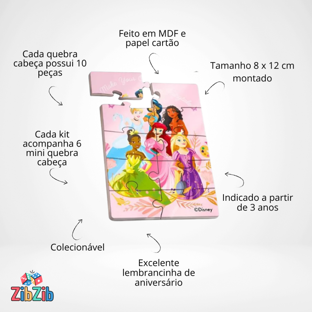 🧩 Kit com 6 Mini Quebra-Cabeças Princesas – Lembrancinha Perfeita! Surpreenda os pequenos com essa lembrancinha super divertida e educativa! O kit contém 6 mini quebra-cabeças com os personagens favoritos das Princesas, perfeitos para animar festas infantis, distribuir em sacolinhas surpresa ou presentear em qualquer ocasião especial. ✨ Detalhes do produto: Cada kit contém 6 unidades de mini quebra-cabeças Estampas variadas com os heróis das Princesas Tamanho ideal para mãos pequenas (12 x 8 cm) Feito em Madeira MDF e papel cartonado Estimula o raciocínio, coordenação motora e concentração Embalagem colorida e pronta para presentear 🎉 Ideal para festas de aniversário, eventos escolares, brindes ou lembrancinhas temáticas. Uma opção criativa que vai encantar a criançada! 🚀 Garanta já o seu kit e torne a festa ainda mais especial!