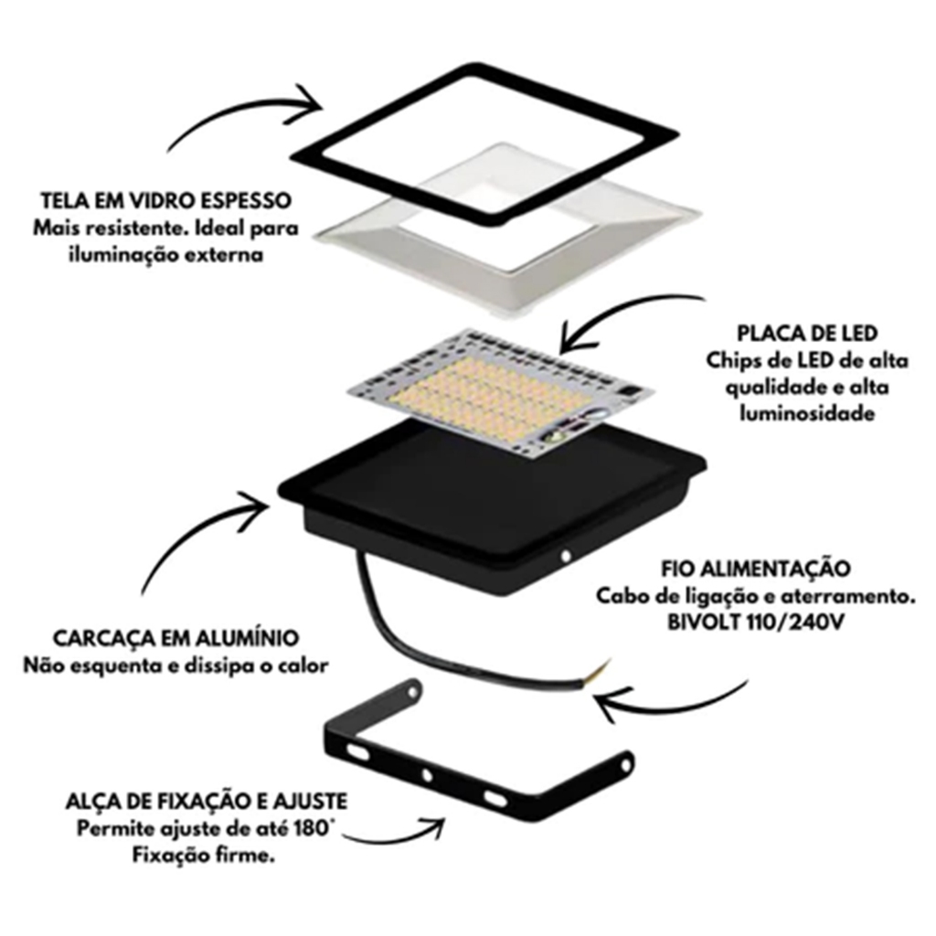 🔐𝗖𝗢𝗠𝗣𝗥𝗔 𝟭𝟬𝟬% 𝗦𝗘𝗚𝗨𝗥𝗔, 𝗙𝗢𝗖𝗔𝗠𝗢𝗦 𝗘𝗠 𝗢𝗙𝗘𝗥𝗘𝗖𝗘𝗥 𝗢 𝗠𝗘𝗟𝗛𝗢𝗥 𝗔𝗧𝗘𝗡𝗗𝗜𝗠𝗘𝗡𝗧𝗢 𝗔𝗢𝗦 𝗡𝗢𝗦𝗦𝗢𝗦 𝗖𝗟𝗜𝗘𝗡𝗧𝗘𝗦 Mini Refletor Led 150w 300w Smd Branco Frio 6500k Holofote IP65 Projetor Slim Ideal para iluminação de fachadas, áreas de lazer cobertas da piscina, coberturas de jardins, árvores, festas, entre outros Os refletores LED são ideais nos dias de hoje. Trazendo elegância, potência e praticidade para a iluminação de qualquer ambiente. Com proteção IP65, o refletor estará sempre protegido contra poeiras, jatos da água não contínuo, respingos (curtas exposições à água) Sendo indicado a instalação em locais secos, cobertos ou semi-cobertos com temperatura entre -10° e 45° ATENÇÃO: Não é indicado que o produto seja instalado submerso à água. Não é indicado que o produto sofra longas exposições de chuva ou umidade. Não indicado para instalação em aquário. Não utilizar em ambientes que causem aquecimento da luminária acima de 45°C. ✨𝗖𝗔𝗥𝗔𝗖𝗧𝗘𝗥𝗜́𝗦𝗧𝗜𝗖𝗔𝗦: - Alta economia de energia. - Não emite radiação infravermelha nem ultravioleta. - Descarte que não prejudicial ao meio ambiente. - Vida útil até 50 vezes maior comparado a outras tecnologias. ✨𝗘𝗦𝗣𝗘𝗖𝗜𝗙𝗜𝗖𝗔𝗖̧𝗢̃𝗘𝗦: - Potência: 150w ou 300w - Temperatura de cor: Branco Frio (6500K) - Modelo: Slim e Compacto - Material: Alumínio e vidro - Carcaça: Alumínio cor preta - Luminosidade: Alta luminosidade para potência - Voltagem: Bivolt - Lumens: 90-100lm/w - Medidas: - 150W: 10x12 cm - 300W:12x16 cm ✨𝗜𝗧𝗘𝗡𝗦 𝗜𝗡𝗖𝗟𝗨𝗦𝗢𝗦: - Refletor LED (Conforme a quantidade selecionada) ✨PERGUNTAS FREQUENTES: Posso instalar dentro da piscina? R: Não é indicado a instalação submersa à água, pois a proteção IP65 não garante vedação total do produto para essa instalação. Pode pegar chuva? R: A proteção garante vedação de jatos da água não intensos, sendo assim, não apropriado para longas tempestades. Posso instalar no banheiro? R: A proteção IP65 não garante vedação contra vapores. Posso instalar no jardim? R: Sim! desde que o produto não sofra longa exposição a jatos intensos, como tempestades. 📸 As imagens do produto são reais 📸