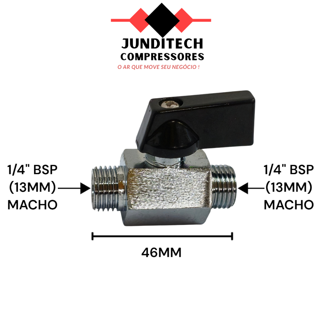 Válvula Esfera 1/4" Macho (Mini Registro) A válvula esfera 1/4" macho é ideal para controle rápido do fluxo de ar ou líquidos, sendo amplamente utilizada em compressores de ar, drenos de reservatórios, redes pneumáticas e redes de água. Seu sistema de abertura e fechamento por alavanca tipo esfera permite operação rápida e segura, garantindo excelente vedação e longa vida útil. Compacta e resistente, é indicada para aplicações onde é necessário interromper ou liberar o fluxo de ar ou água de forma prática. ESPECIFICAÇÕES TÉCNICAS Produto: Válvula Esfera / Mini Registro Material: Aço / Zamac de alta resistência Rosca: 1/4" BSP macho Diâmetro externo da rosca: aproximadamente 13 mm Diâmetro interno de passagem: aproximadamente 8 mm Comprimento total: 46 mm Altura: 35 mm (considerando a alavanca) Comprimento da alavanca: 30 mm Cor do corpo: Metal polido Cor da alavanca: Preta APLICAÇÃO Indicada para diversas aplicações, como: Saída de ar para compressores Dreno de reservatórios de ar comprimido Redes de ar comprimido Redes de água Sistemas pneumáticos Mini registros de controle de fluxo BENEFÍCIOS DO PRODUTO Abertura e fechamento rápido por alavanca Excelente vedação Alta durabilidade Compacta e fácil de instalar Ideal para dreno de reservatório ou saída de ar OBSERVAÇÃO IMPORTANTE Antes da compra, verifique se a rosca 1/4" BSP é compatível com o seu equipamento ou sistema, garantindo uma instalação correta.