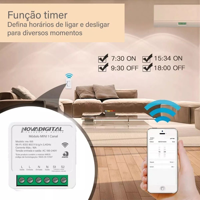 Automatize sua casa de forma simples e acessível! O Mini Módulo Wi-Fi Inteligente NovaDigital permite ligar e desligar luzes e aparelhos elétricos pelo celular ou por comando de voz, direto com Alexa ou Google Assistant. Ideal para quem quer transformar sua casa em um ambiente inteligente, com instalação rápida e controle total na palma da mão! ✅ Principais Vantagens: ✔️ Compatível com assistentes de voz: Alexa e Google Assistant ✔️ Controle remoto via celular – Apps Smart Life, Tuya ou NovaDigital ✔️ Agendamento de horários, temporizador e notificações no app ✔️ Fácil instalação – modelo compacto, cabe dentro da caixinha 4x2 ✔️ Wi-Fi 2.4GHz (não compatível com 5GHz) ✔️ Produto homologado pela Anatel ✔️ Ideal para automação de luzes, ventiladores, cafeteiras e mais ⚙️ Especificações Técnicas: Tensão de operação: 100V–240V AC (Bivolt) – 50/60Hz Corrente máxima: 16A Potência máxima: 1100W (110V) / 2200W (220V) Conexão: Wi-Fi 2.4GHz (IEEE 802.11 b/g/n) Controle via app: Smart Life, Tuya ou NovaDigital (iOS e Android) Material: Policarbonato anti-chamas (PC V0) Medidas: 4,1 x 4,1 x 2,0 cm Peso: 35g Modelo: MS-105 | Módulo: WB2S Cor: Branco Certificação ANATEL: 116052011765 1 canal (não dimmer) 📦 Conteúdo da Embalagem: 1x Mini Módulo Rele Wi-Fi Inteligente 1 Canal – NovaDigital 1x Manual em português ⚠️ Observações Importantes: Funciona somente com Wi-Fi 2.4GHz Desative temporariamente o 5GHz do roteador durante a configuração Antes do uso, faça o reset no botão físico do módulo Siga o passo a passo do aplicativo para configurar facilmente 💡 Indicado para: Automação residencial Controle inteligente de iluminação Integração com comandos de voz Projetos com caixa de embutir padrão 4x2 🔧 Transforme sua casa em uma Smart Home com baixo custo e alta eficiência!