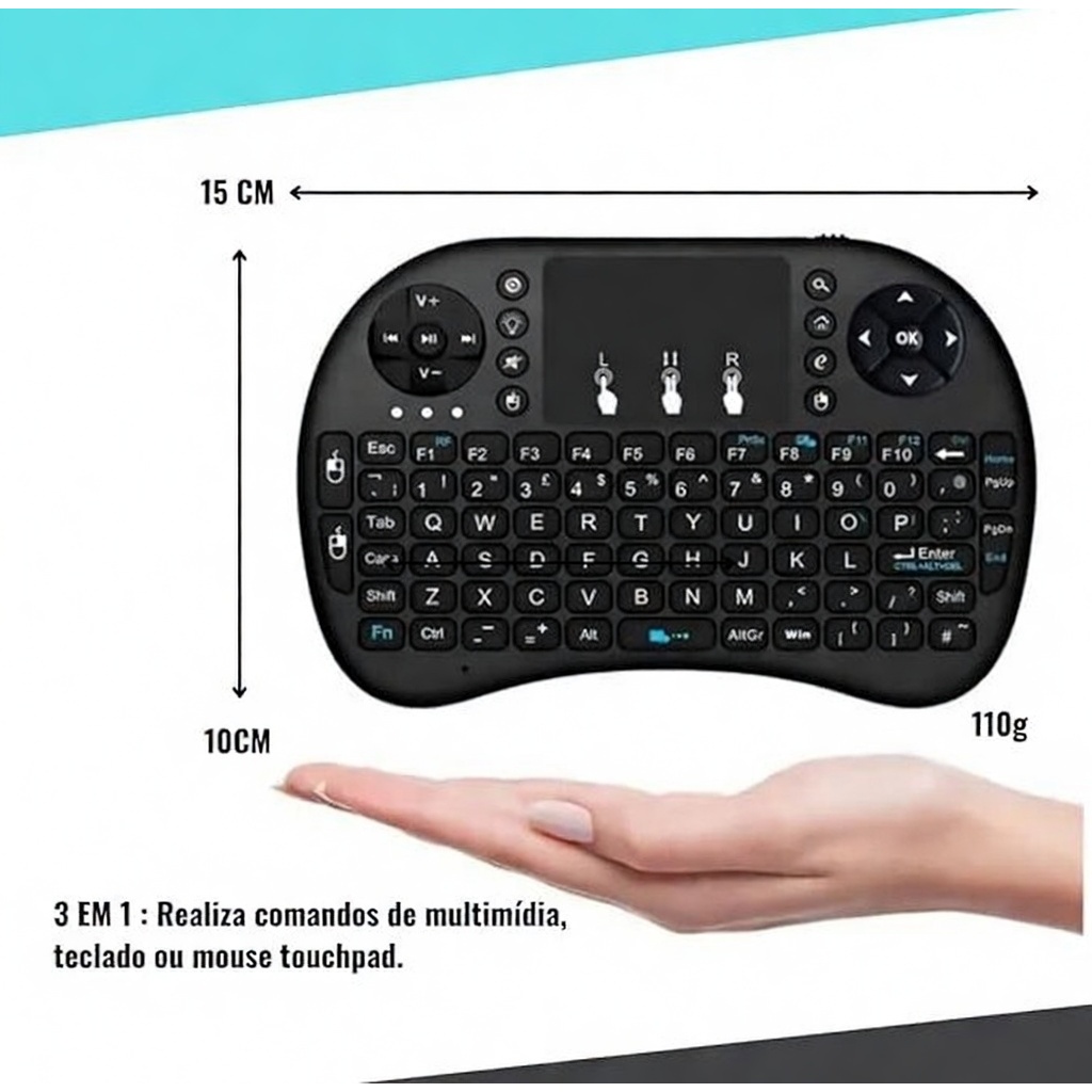 Olá, seja muito bem-vindo(a) à nossa loja! 😊 Trabalhamos para oferecer produtos de qualidade, com envio rápido e atendimento sempre disponível para tirar suas dúvidas pelo chat. 🎮 Mini Teclado Wireless com Touchpad e LED RGB Tenha controle total na palma da sua mão! O Mini Teclado Wireless com touchpad integrado permite controlar diversos dispositivos com praticidade e conforto, sem precisar de fios. Ideal para usar em Smart TVs, TV Box, computadores, notebooks, videogames e até alguns smartphones e tablets, oferecendo uma experiência muito mais prática para navegar, digitar e controlar seus aparelhos à distância. Com teclado completo no padrão QWERTY, teclas de atalho, setas direcionais e touchpad integrado, você pode utilizar o dispositivo como teclado e mouse ao mesmo tempo. Seu alcance de até 10 metros permite controlar seus dispositivos com total liberdade, perfeito para assistir filmes, navegar na internet, acessar e-mails ou controlar aplicativos diretamente do sofá. Além disso, conta com iluminação LED RGB, ideal para utilizar em ambientes com pouca luz. Compacto, leve e portátil, é perfeito tanto para entretenimento quanto para uso profissional. ✨ Destaques do Produto ✔ Teclado sem fio compacto e portátil ✔ Touchpad integrado para controle do mouse ✔ Iluminação LED RGB (Azul, Verde e Vermelho) ✔ Conexão Wireless 2.4GHz estável ✔ Alcance de até 10 metros ✔ Bateria recarregável de longa duração ✔ Compatível com diversos dispositivos 📋 Especificações Modelo: Controle LED Cor: Preto Conexão: USB Dongle Wireless (armazenado no compartimento traseiro) Frequência: 2.4GHz Idioma do Teclado: Português ABNT (com tecla "ç") Iluminação: Azul, Verde e Vermelho (Fn + F2 para alterar) Sensibilidade do Mouse: 800 DPI (padrão) Função Touch Vertical: Fn + Esc Alcance Máximo: até 10 metros (sem obstáculos) Compatibilidade Smart TV TV Box PC e Notebook Android Videogames: Xbox 360, Xbox One, PS3 e PS4 Sistema Operacional Windows XP, 2000, Vista, 7 Linux (Debian, Ubuntu, Fedora) Bateria Tipo: Lítio Recarregável Capacidade: 3.7V 1020mAh Dimensões Produto: 9 x 14,5 x 2 cm (aprox.) Embalagem: 17 x 11 x 3 cm (aprox.) Peso: 110g 📦 Conteúdo da Embalagem 1x Mini Teclado Wireless 1x Cabo de Carregamento Micro USB ⭐ Siga nossa loja para acompanhar novidades e ofertas exclusivas! Temos diversos produtos com preços imperdíveis. Após receber seu produto, não esqueça de confirmar a entrega e deixar sua avaliação. Seu feedback é muito importante para nós! 💬 Ficou com alguma dúvida? Entre em contato pelo chat do vendedor, teremos prazer em ajudar
