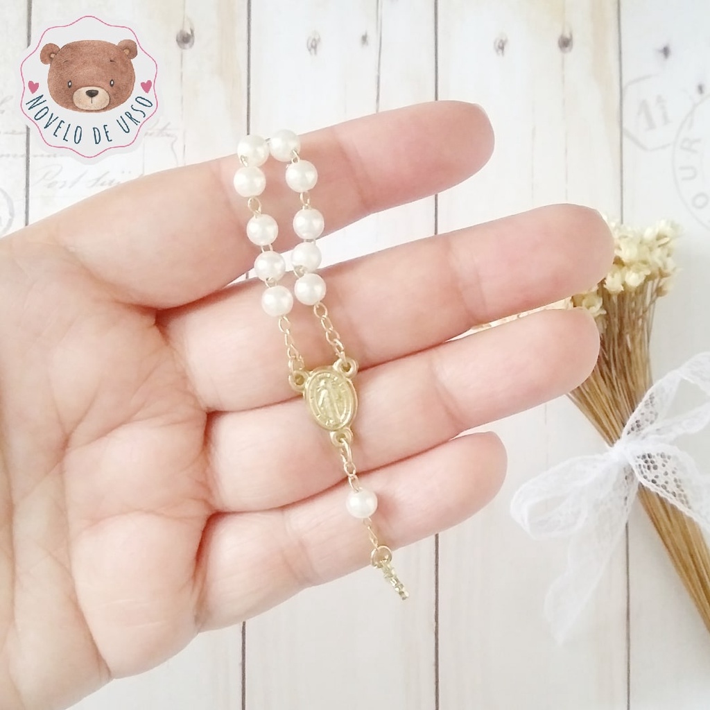 Mini terço dezena para lembrancinhas, santinhas de crochê (amigurumi) e artesanato em geral. Tamanho aproximado 9 cm. Cores: pérola com prata, pérola com dourado, rosa com prata ou azul com prata. Medida da pérola: 5mm Embalagem com 3 unidades. A venda é somente do mini terço, os demais itens da foto são meramente ilustrativos.