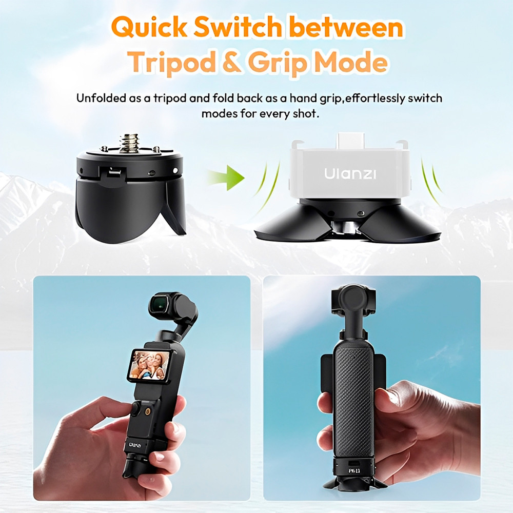 Mini Tripé Ulanzi PK-08 com Rosca 1/4" para DJI Osmo Pocket 3, Compacto, Leve e Conversível em Alça de Pegada 1. Compatibilidade perfeita com DJI Osmo Pocket 3 Projetado sob medida, o Ulanzi PK-08 substitui a alça original e se encaixa diretamente no case do Osmo Pocket 3, oferecendo mais praticidade no transporte e uso. 2. Função 2 em 1: tripé e alça de pegada Transforma-se rapidamente de tripé compacto em alça ergonômica, garantindo maior estabilidade e segurança ao gravar com a câmera na mão. 3. Construção robusta e leve Fabricado em alumínio, aço e silicone, pesa apenas 27 g, mantendo alta durabilidade e capacidade de carga de até 1 kg sem comprometer a portabilidade. 4. Rosca 1/4" e parafusos ARRI para expansão Inclui rosca universal e fixação ARRI, permitindo conexão com diversos acessórios fotográficos e de vídeo para setups personalizados. 5. Portabilidade ideal para criadores Compacto e fácil de transportar, é perfeito para vloggers, viajantes e produtores de conteúdo que precisam de agilidade e confiabilidade. Garantia 90 dias