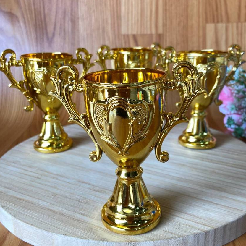 Mini Troféu Dourado (ATENÇÃO PARA AS MEDIDAS ABAIXO) Medidas aproximadas: 9.5 cm de altura / 5 cm diâmetro Material: Plástico Metalizado Cor: dourado Composição: Plástico metalizado * POR FAVOR SE ATENTE AS MEDIDAS DO PRODUTO ANTES DA COMPRA.