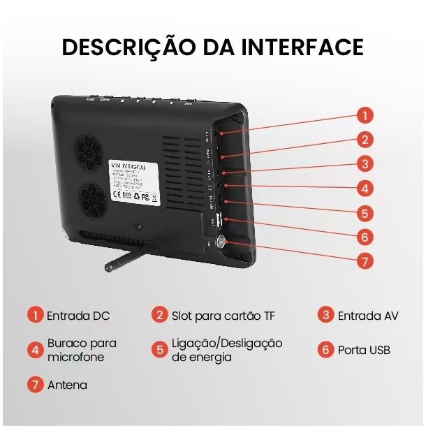 TV PORTÁTIL 7" oasis Cor: Preto Voltagem :127/220V Conectividade: Com USB :Sim Com HDMI :Nao Tela Tamanho da tela : 7 " Tipo de resolução :HD Tipo de tela : LCD Especificações: É smarte : Nao É 3D :Não É curvo : Não É portátil :Sim A TV Portátil 7“ te permite aproveitar o seu conteúdo preferido onde quer que esteja. Ideal para levar em viagens ou ser usada em espaços pequenos. Conta com entradas: USB, Cartão de memória, AV, Fone de ouvido e Antena. Indicado Para: - Levar em viagens ou usar em espaços pequenos. Dicas Para Uso: - Carregue a TV; - Conecte a antena ou o que desejar através de um de suas saídas (USB, Cartão de Memória) - Leia o manual com atenção para configurar a sua TV. (Cuidados) 1. Leia este manual atentamente antes de usar o produto, para que você possa estar em conformidade com todos as prática e cuidados do manual. 2. Devido ao risco de alta voltagem, não tente reparar o aparelho por conta própria. Todos os serviços de reparo e manutenção devem ser feitos por profissionais qualificados. 3. A fonte ideal está na categoria de energia. Consulte neste manual a parte de energia para o uso correto e de acordo com as especificações. 4. A unidade deve ser usada com uma voltagem correspondente. Verifique nas informações marcadas na parte de trás do aparelho. 5. Não deixe o aparelho perto da janela, em direção à luz solar, locais molhados ou em lugares onde possam cair. 6. Retire o conector da fonte de alimentação ao limpá-lo. Não utilize produtos químicos, use apenas um pano macio para limpeza 7. Retire o conector da tomada caso não for usar o aparelho por um longo período ou se estiver trovejando. Seleção de potência e cuidados Fonte de energia AC Utilize um Fonte de energia AC com 100V-240V (verifique a tabela de instruções do adaptador) • Carregador para carro Use o adaptador para carro (adaptador de aterramento negativo), apenas adaptador para automóvel com potência de 12V é compatível com essa unidade) Entrada e saída do sinal externo • DTV Conecte a antena externa, cabo ou entrada de rádio com o cabo coaxial de 759, pressione o botão INPUT, o sinal DTV é conectado quando a tela mostra DIV. Caso for utilizar a função de televisão pela primeira vez, procure os canais no menu (veja a página 6). • AVIN & OUT Conecte o cabo AV com outra entrada ou saída AV, depois pressione o botão INPUT; selecione modo AV e ele irá aparecer na tela. • USB/Cartão TF Insira o USB/Cartão TF na máquina, escolha o modo USB/Cartão TF para reproduzir as midias. ATV Conecte a antena com o aparelho, ele irá procurar programas de TV local automaticamente. • VGA A matriz gráfica de vídeo (Video Graphic Array) é um padrão gráfico para computadores pessoais e conectores associados • HD IN Conecte o cabo HD no aparelho, ele obterá entrada HD para reproduzir o video • Rádio FM Conecte a antena e ative o modo "Rádio FM" para receber sinal de rádio.Causa antes de solicitar o servico de reparo