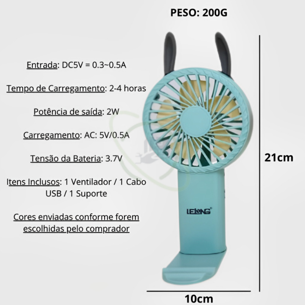 Seja bem-vindo a Match Made! Atuamos no mercado a mais de 10 anos e estamos aqui para proporcionar a melhor experiência como cliente que você possa ter. Somos qualificados como o melhor envio da plataforma, e por esse motivo você irá receber seu produto da melhor forma possível! São as últimas unidades disponíveis, vai esperar o que para garantir o seu agora?! Apresentamos o Ventilador Portátil da Lelong: conforto e praticidade onde quer que você esteja! Com 3 velocidades ajustáveis e potência de 2W, mantenha-se refrescado em movimento. Acompanha suporte para celular, permitindo que você desfrute de vídeos enquanto se refresca. Com uma bateria de longa duração de 4 a 12 horas, é perfeito para uso prolongado. Disponível em três cores vibrantes: rosa, azul e verde - escolha a sua preferida! Inclui cabo USB para carregamento e suporte para maior comodidade. Experimente o conforto portátil com o Ventilador Lelong! Especificações: Entrada: DC5V = 0.3~0.5A Tempo de Funcionamento: 4-12 horas Tempo de Carregamento: 2-4 horas Dimensões: 10x4,5x21cm Potência de saída: 2W Carregamento: AC: 5V/0.5A Tensão da Bateria: 3.7V Itens Inclusos: 1 Ventilador / 1 Cabo USB / 1 Suporte Region of Origin:Mainland China
