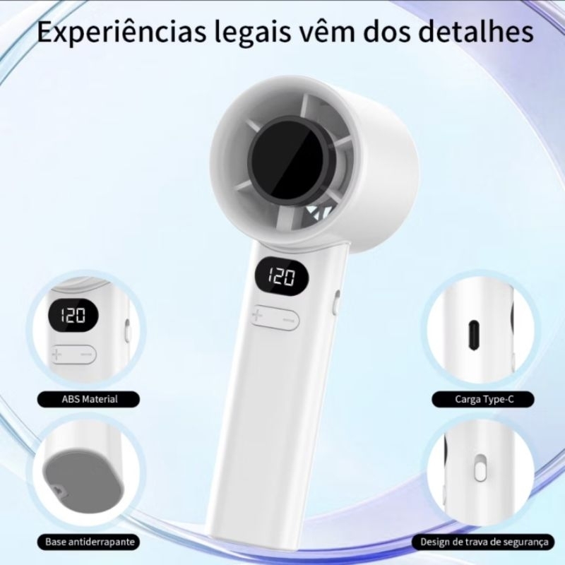 Mini Ventilador Portátil USB Recarregável Turbo 120 Velocidades Display Digital