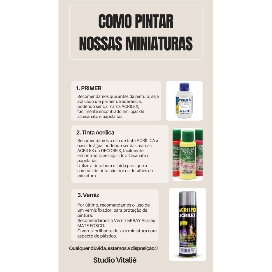 Nossas miniaturas 3D são impressas com resina de alta qualidade e definição, em resina na cor branca, o que facilita na pintura posterior. Recomendamos o uso de Primer para fixação. - O prazo de envio das miniaturas sem pintura é de até 2 dias úteis. - Altura: 4cm Caso tenha alguma dúvida, não hesite em nos perguntar :) Studio Vitaliê
