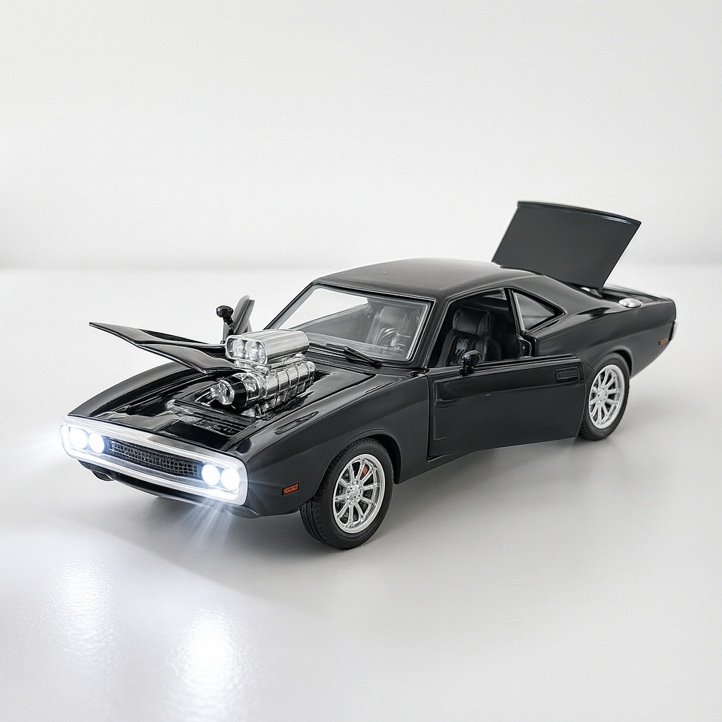 Miniatura Dodge Charger R/T 1970 com Luz, Som e Fricção – Edição Premium Diecast Escala 1:24 A miniatura inspirada no Dodge Charger R/T 1970 reúne presença, detalhes fiéis e recursos eletrônicos que elevam a experiência a outro nível. Construída em metal com acabamento automotivo e detalhes cromados, esta peça é ideal tanto para colecionadores quanto para admiradores de muscle cars clássicos. O modelo conta com faróis funcionais em LED, efeitos sonoros ativados ao pressionar ou movimentar, sistema de fricção que permite deslocamento ao puxar e soltar, além de portas e capô totalmente funcionais. O motor blower cromado é o destaque visual, ressaltando a identidade marcante do Charger 1970. É um item robusto, bem elaborado e com excelente presença na estante, mesa ou prateleira. Um modelo colecionável de alto impacto visual. DESTAQUES DO PRODUTO - Miniatura inspirada no Dodge Charger R/T 1970. - Luz de faróis em LED. - Efeitos sonoros automotivos (aceleração e motor). - Sistema de fricção: puxe para trás e solte. - Portas funcionais. - Capô abre e exibe motor cromado. - Acabamento premium em metal. - Pneus emborrachados. - Detalhamento externo e interno realista. - Ideal para colecionadores e decoração. ESPECIFICAÇÕES TÉCNICAS. - Modelo: Dodge Charger R/T 1970 (inspiração). - Tipo: Miniatura Diecast. - Material: Metal + ABS. - Rodas: Emborrachadas. - Funções: Luz, som, fricção, portas e capô abrem. Dimensões aproximadas: - Escala: 1:24 - Comprimento: 22cm. - Largura: 7 cm. - Altura: 5,5 cm. - Peso aproximado: 280 g. - Idade recomendada: a partir de 6 anos. - Garantia: 30 dias contra defeito de fabricação. - Produto novo e lacrado.