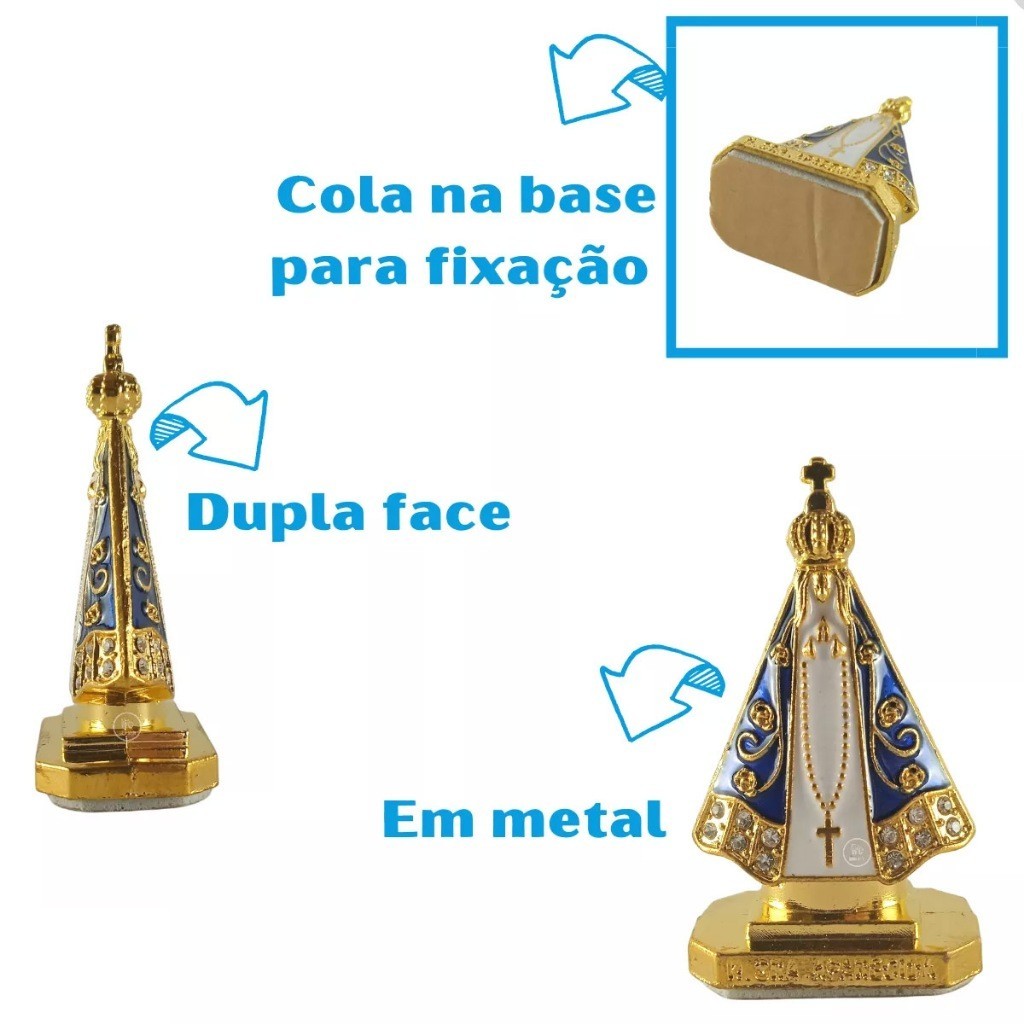 KIT com 5 Imagens Nossa Senhora Aparecida Metal Carro Escritório Dupla Face 5cm com embalagem individual. Linda imagem de Nossa Senhora Aparecida. Sua base acompanha adesivo, podendo ser fixada no painel do carro, ou como decoração no lugar onde desejar. Confeccionada em metal folheado e manto colorido, resistente ao sol, delicada e discreta. Conferimos todos os produtos ante do envio. Linda imagem de Nossa Senhora Aparecida dourada folheada com fita dupla face na base para colar em painel de carro ou colocar em estante e mesa de escritório. Essa imagem tem a função simbólica de apresentar Nossa Senhora Aparecida de maneira singela em um ambiente dentro do carro ao longo da viagem ou no escritório durante o trabalho. Material:Metal Pintura Folheada Altura 5 cm Peso Aproximado 20g Qualquer duvida nos chame no CHAT SHOPEE, será um prazer te atender.
