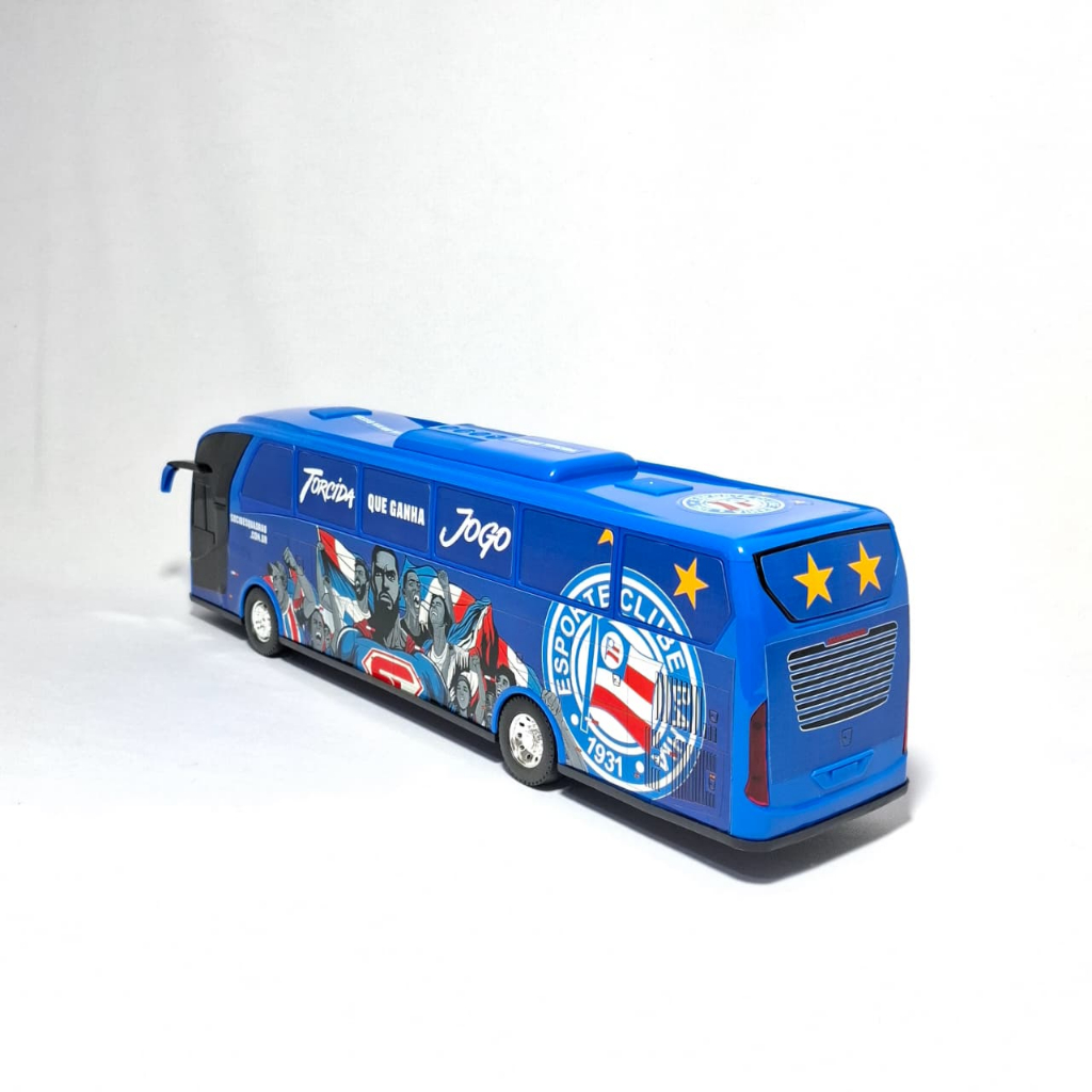 ÔNIBUS OFICIAL DO BAHIA *Produto Original e Licenciado. *Com Nota Fiscal e Garantia. A paixão pelo futebol agora pode ser vivida de perto com a nossa incrível réplica do ônibus do time do Bahia Com 42 cm de comprimento, este brinquedo é perfeito para os pequenos torcedores e também para os colecionadores apaixonados pelo Bahia Cada detalhe foi cuidadosamente reproduzido para que você tenha em mãos uma réplica fiel ao ônibus utilizado pelos jogadores do Bahia. É como ter um pedaço da história do nosso Bahia! Com um design detalhado e fiel do utilizado pelos nossos craques, este ônibus é perfeito para a criançada brincar e para os marmanjos colecionar, proporcionando horas de diversão e imaginação. Desde os logotipos até as janelas, cada aspecto foi projetado para capturar a essência do ônibus original, tornando-o um item indispensável para qualquer torcedor. Fabricado em plástico atóxico e adesivos prime, ele combina durabilidade e segurança, ideal para brincadeiras intensas. E o mais legal. Fora seu lindo design, seus pneus são de borracha e as rodas cromadas. BENEFÍCIOS: Este não é apenas um brinquedo; é uma peça de coleção que representa a grandeza do Bahia. Ideal tanto para brincar quanto para colecionar e exibir com orgulho! Se o seu filho é fã de futebol ou está começando a se interessar pelo esporte, essa réplica é uma ótima maneira de incentivar o amor pelo Bahia.