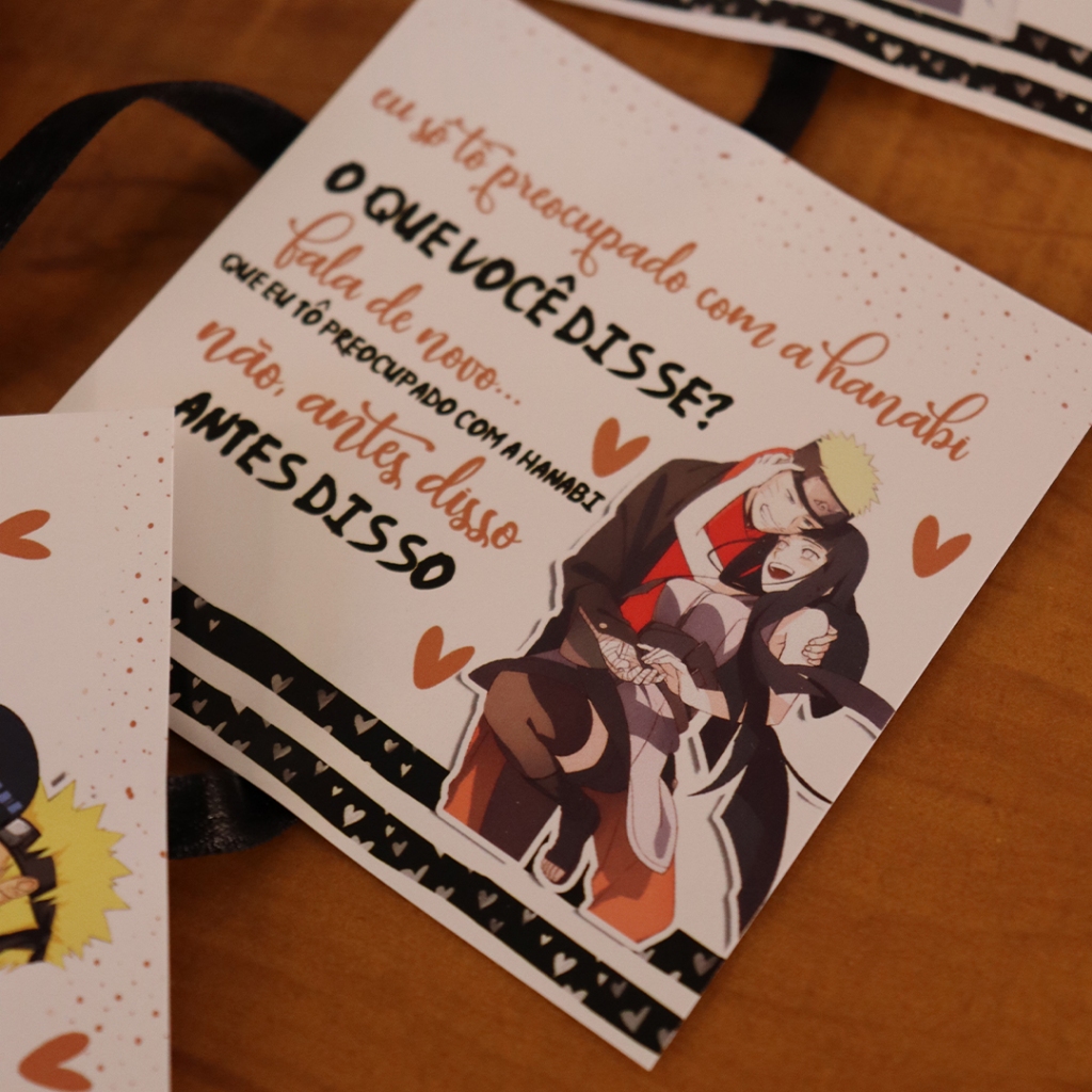 Mini Box Naruto e Hinata Surpreenda a pessoa amada neste Dia dos Namorados com um presente! Nossa Mini Naruto e Hinata é uma homenagem romântica ao casal. Dentro desta encantadora caixinha, você encontrará 5 cartões exclusivos com frases icônicas. Cada cartão é uma lembrança do amor incondicional e das aventuras hilárias que os dois compartilham.