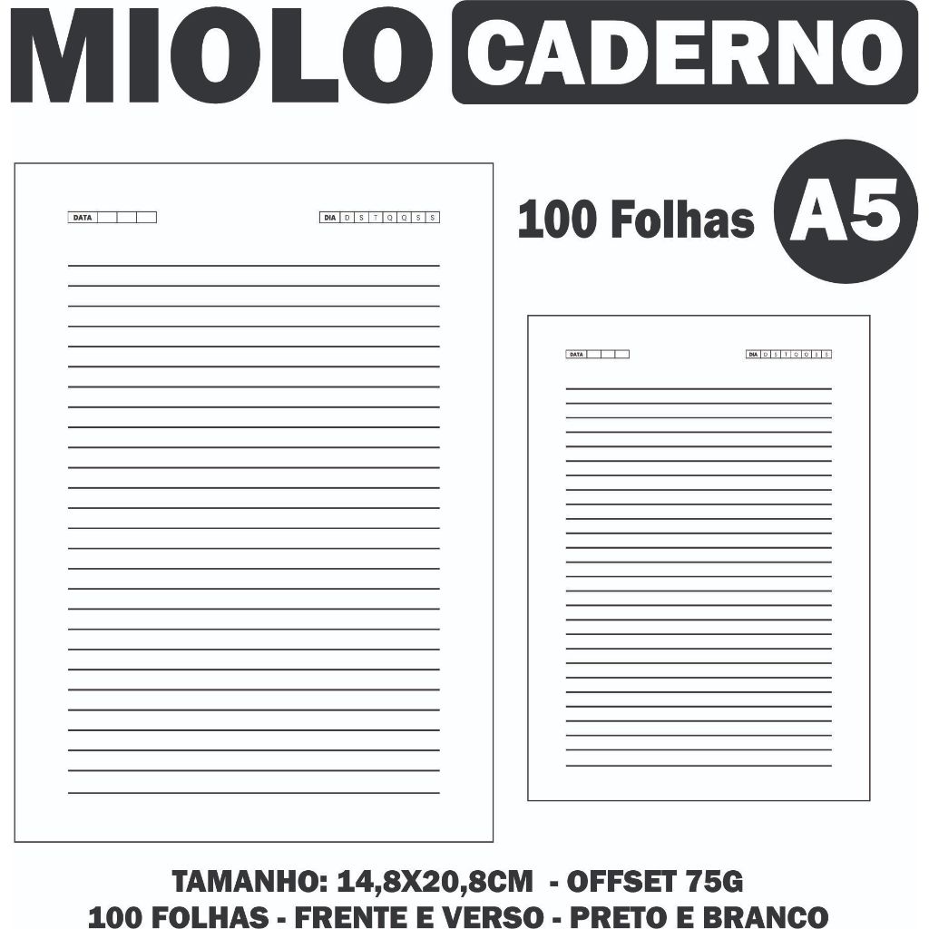 Miolo Pautado A5 para Caderno – 100 folhas - Offset 75G. 1/1 PB - Kit 5/10/15