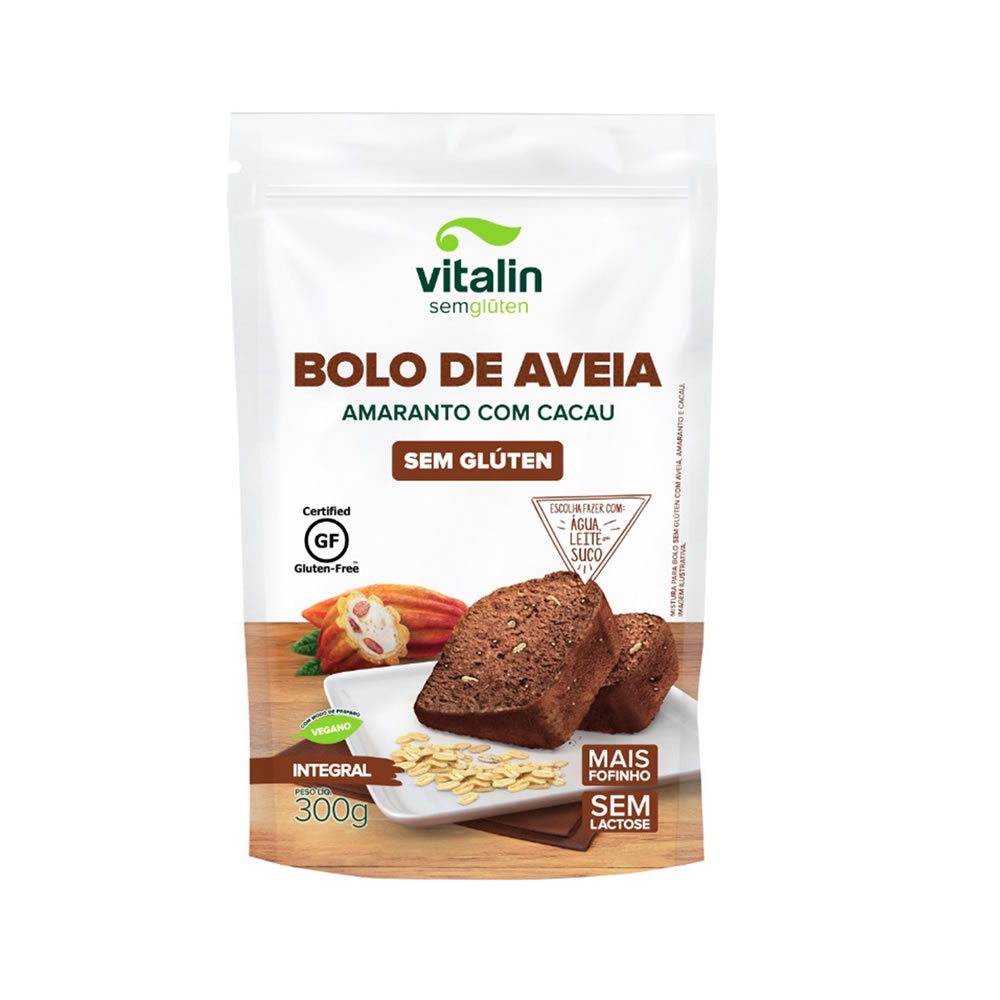 Mistura Integral para Bolo de Aveia, Amaranto e Cacau Sem Glúten 300g - Vitalin