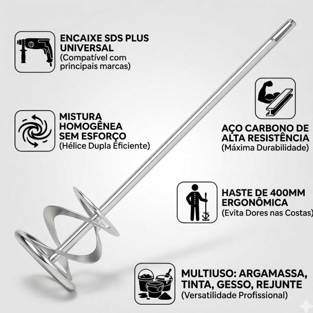 ENVIAMOS COM NOTA FISCAL CONTÉM: 01 UNIDADE MISTURADOR SDS 80X400MM O Misturador SDS Plus 80x400mm é a ferramenta definitiva para o profissional que busca eficiência industrial na palma da mão. Desenvolvido com geometria de hélice dupla helicoidal, ele garante uma mistura 100% homogênea, sem grumos ou bolhas de ar, em uma fração do tempo que você levaria manualmente. POR QUE ESTE MISTURADOR É SUPERIOR? Diferente de batedores genéricos que entortam no primeiro uso, nossa haste é fabricada em aço carbono reforçado com tratamento anticorrosivo. O encaixe SDS Plus permite o acoplamento direto em marteletes, transformando sua ferramenta de impacto em uma estação de mistura potente e estável. ESPECIFICAÇÕES TÉCNICAS (DADOS PARA DECISÃO): Conexão: Encaixe SDS Plus (Compatível com as principais marcas do mercado) Dimensões da Hélice: 80mm de diâmetro (Ideal para baldes e galões) Comprimento Total: 400mm (Ergonomia garantida para evitar dores nas costas) Material: Aço carbono de alta resistência Aplicações: Argamassa, tinta, rejunte, gesso, massa corrida, resina epóxi, cimento cola, sabão e entre outros. BENEFÍCIOS DIRETOS: Acabamento Profissional: Massa lisa e sem bolhas facilita a aplicação e economiza material. Durabilidade Extrema: Projetado para suportar o torque de marteletes profissionais sem sofrer deformações. Versatilidade: Uma única ferramenta para preparar desde a fundação até o acabamento fino da pintura. FAQ - AS 5 PRINCIPAIS DÚVIDAS 1. Serve em qualquer furadeira comum? Não. Este modelo possui encaixe SDS Plus, específico para marteletes. Se sua furadeira for de mandril convencional (com chave), você precisará de um adaptador SDS para mandril, porém o uso direto no martelete garante muito mais torque e segurança. 2. Ele aguenta misturar argamassa, que é mais pesada? Sim. A estrutura em aço reforçado e a soldagem industrial da hélice foram projetadas justamente para materiais de alta densidade como a argamassa AC3, garantindo que a haste não entorte durante o processo. 3. O batedor espirra muita tinta para fora do balde? O segredo está na hélice helicoidal. Ela foi desenhada para criar um fluxo de baixo para cima, mantendo a mistura dentro do recipiente. Recomendamos iniciar a rotação em velocidade baixa para garantir total controle. 4. É fácil de limpar após o uso? Extremamente. Por ser feito de aço com acabamento polido, basta mergulhar o misturador em um balde com água limpa logo após o uso e acionar a ferramenta por alguns segundos. A própria rotação removerá os resíduos.