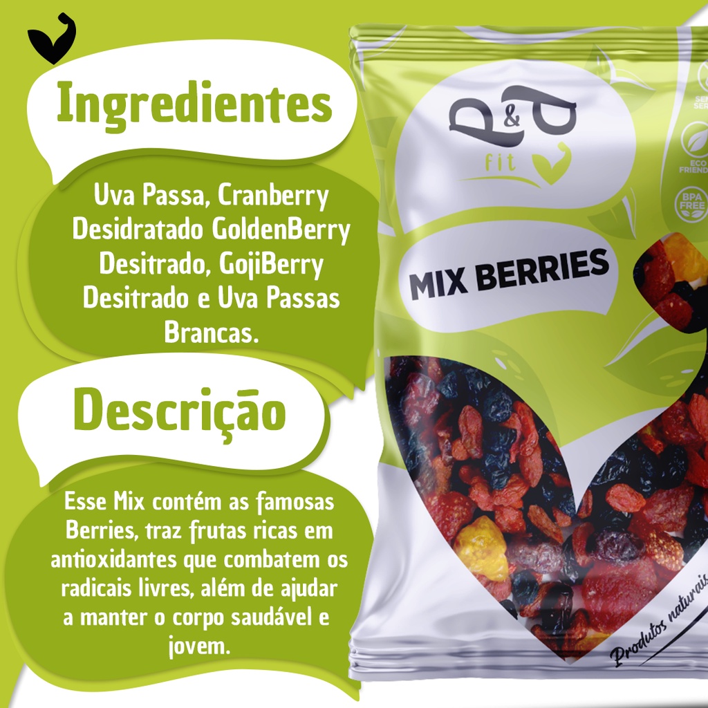 Mix de Berries P&P Ingredientes: Uva Passa, Cranberry Desidratado, Golden Berry Desidratado e GojiBerry DesidratadoDescrição: Esse Mix contém as famosas Berries, traz frutas ricas em antioxidantes que combatem os radicais livres, além de ajudar a manter o corpo saudável e jovem Uva Passas: Previne a prisão de ventre As uvas passas são ricas em fibras solúveis e insolúveis que ajudam a aumentar o volume das fezes e a torná-las mais macias, estimulando o funcionamento do intestino e facilitando a sua expulsão. Cranberry: Ajuda a tratar problemas no trato urinário O cranberry é que ele possui substâncias anti-inflamatórias e antioxidantes que são fundamentais para a saúde do sistema urinário. Ele ajuda a prevenir infecções, auxilia no tratamento de incontinência urinária e ainda tem efeito diurético - isto é, ajuda a aumentar o fluxo de urina e a eliminar toxinas presentes no corpo. Golden berry: Colabora para reduzir o cansaço e a fadiga Por ser rico em ferro, muitos consideram o golden berry especialmente benéfico para vegetarianos e veganos, que não consomem carne. Essa fruta contém aminoácidos essenciais. Desta forma, dentro de uma dieta balanceada, pode ser uma opção de alimento fonte de proteínas e ferro em substituição à carne vermelha, e suprir parte da necessidade desses nutrientes Goji Berry: Prevenir o envelhecimento precoce O consumo regular de goji berry ajuda a prevenir o envelhecimento prematuro da pele, pois é rico em vitamina C, um micronutriente que favorece a formação de colágeno e ajuda a dar firmeza e elasticidade à pele, evitando a formação de rugas e linhas de expressão. Além disso, também possui betacarotenos, polifenóis e outros antioxidantes que produzem um efeito protetor na pele contra os raios ultravioletas (UV) do sol, evitando a formação de manchas. Linha de Mix P&P, diferente de tudo que você já experimentou! Feito com produtos frescos e selecionados para todos o tipo de gosto. Confira também nossos outros sabores. Sobre a empresa: A P&P Linha Fit é uma empresa especializada em produtos naturais. Com uma estrutura de ponta para a manipulação de alimentos, fracionamos as sacas e vendemos em embalagens ideias para o nosso consumidor final. A política da Garantia de Satisfação faz com que nossos produtos passem por um rigoroso controle de qualidade levando o melhor produto a mesa do nosso cliente com um preço justo. Obrigado por comprarem nossos produtos! Sobre o envio: A PRONTA ENTREGA- ENVIO EM ATÉ 24 HORAS ÚTEIS! DÚVIDAS DE SEMPRE: 1) Em quando tempo meu pedido será enviado? ENVIAMOS O SEU PRODUTO EM ATÉ 24 HORAS APÓS A APROVAÇÃO DO PAGAMENTO. 2) E se meu produto não chegar? TODOS OS PACOTES SEGUEM COM O PROTOCOLO DE RASTREIO, E VOCÊ PODE CONSULTAR DIARIAMENTE NO SITE DOS CORREIOS, PARA VER ONDE ELE ESTA. CASO OCORRA ALGUM SINISTRO, A MERCADORIA ESTÁ ASSEGURADA PELO SISTEMA DO MARKETPLACE E VOCÊ RECEBE SEU DINHEIRO DE VOLTA. 3) Qual a validade? VOCÊ IRÁ ENCONTRAR A VALIDADE ASSIM COMO O NÚMERO DO LOTE NA PARTE SUPERIOR DA EMBALAGEM. TRABALHAMOS APENAS COM PRODUTOS FRESCOS, DESSA FORMA VOCÊ RECEBERÁ O PRODUTO COM UMA VALIDADE EXTENSA. DEPENDENDO DO PRODUTO, DE ATÉ 2 ANOS. Ficou com alguma dúvida? Entre em contato com a gente!