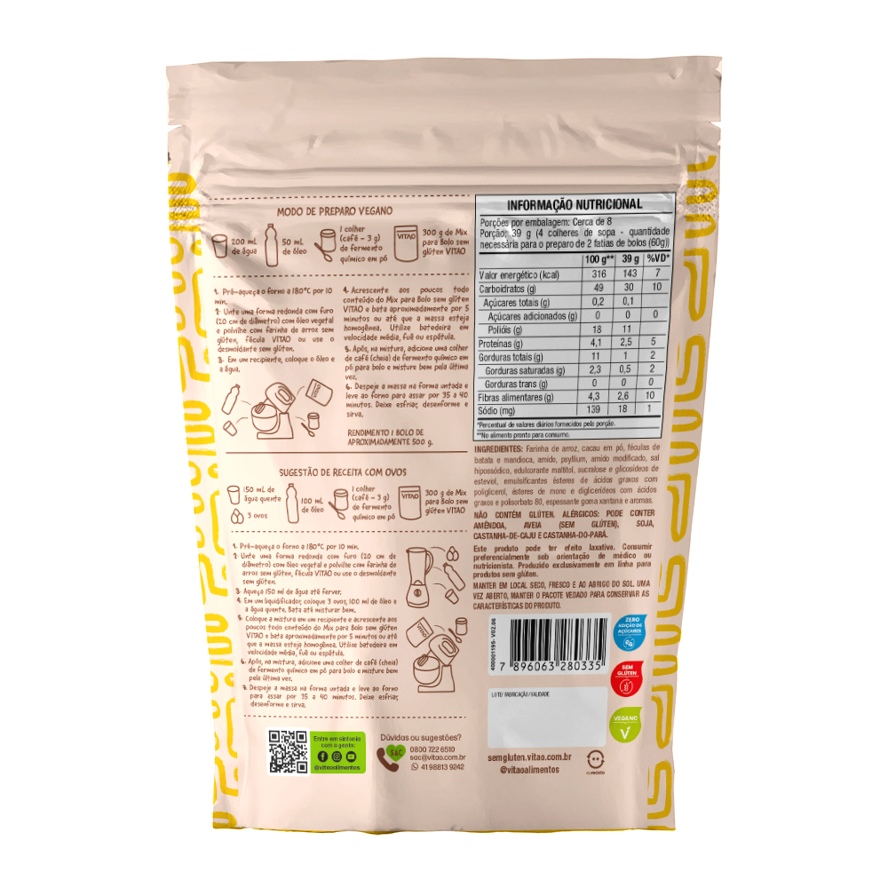 Mix de Bolo Sem Glúten Vitao: Uma opção deliciosa para quem busca uma alternativa sem glúten. Desfrute desse mix de bolo da Vitao, que proporciona um sabor incrível e uma textura macia, leve e fofinha. Por ser uma mistura pronta, é só seguir uma receita fácil e rápida para desfrutar do seu bolo quentinho. MODO DE PREPARO VEGANO: - 200 mL de água - 50 mL de óleo - 1 colher (café-3 g) de fermento químico em pó - 300 g de Mix para Bolo sem glúten VITAO 1. Pré-aqueça o forno a 180°C por 10 min. 2. Unte uma forma redonda com furo (20 cm de diâmetro) com óleo vegetal e polvilhe com farinha de arroz sem glúten, fécula VITAO ou use o desmoldante sem glúten. 3. Em um recipiente, coloque o óleo e a água. 4. Acrescente aos poucos todo conteúdo do Mix para Bolo sem glúten VITAO e bata aproximadamente por 5 minutos ou até que a massa esteja homogênea. Utilize batedeira em velocidade média, fuê ou espátula. 5. Após, na mistura, adicione uma colher de café (cheia) de fermento químico em pó para bolo e misture bem pela última vez. 6. Despeje a massa na forma untada e leve ao forno para assar por 35 a 40 minutos. Deixe esfriar, desenforme e sirva. RENDIMENTO 1 BOLO DE APROXIMADAMENTE 500 g. SUGESTÃO DE RECEITA COM OVOS: - 150 mL de água quente - 3 ovos - 100 mL de óleo - 1 colher (café-3 g) de fermento químico em pó - 300 g de Mix para Bolo sem glúten VITAO 1. Pré-aqueça o forno a 180°C por 10 min. 2. Unte uma forma redonda com furo (20 cm de diâmetro) com óleo vegetal e polvilhe com farinha de arroz sem glúten, fécula VITAO ou use o desmoldante sem glúten. 3. Aqueça 150 ml de água até ferver. 4. Em um liquidificador, coloque 3 ovos, 100 ml de óleo e a água quente. Bata até misturar bem. 5.Coloque a mistura em um recipiente e acrescente aos poucos todo conteúdo do Mix para Bolo sem glúten VITAO e bata aproximadamente por 5 minutos ou até que a massa esteja homogênea. Utilize batedeira em velocidade média, fuê ou espátula. 6. Após, na mistura, adicione uma colher de café (cheia) de fermento químico em pó para bolo e misture bem pela última vez. 7. Despeje a massa na forma untada e leve ao forno para assar por 35 a 40 minutos. Deixe esfriar, desenforme e sirva. INGREDIENTES: Farinha de arroz, cacau em pó, féculas de batata e mandioca, amido, psyllium, amido modificado, sal hipossódico, edulcorante maltitol, sucralose e glicosídeos de esteviol, emulsificantes ésteres de ácidos graxos com poliglicerol, ésteres de mono e diglicerídeos com ácidos graxos e polisorbato 80, espessante goma xantana e aromas. ALÉRGICOS: PODE CONTER AMÊNDOA, AVEIA (SEM GLÚTEN), SOJA, CASTANHA-DE-CAJU E CASTANHA-DO-PARÁ. NÃO CONTÉM GLUTEN. SEM GLÚTEN, VEGANO, ZERO ADIÇÃO DE AÇÚCARES, FONTE DE FIBRAS.