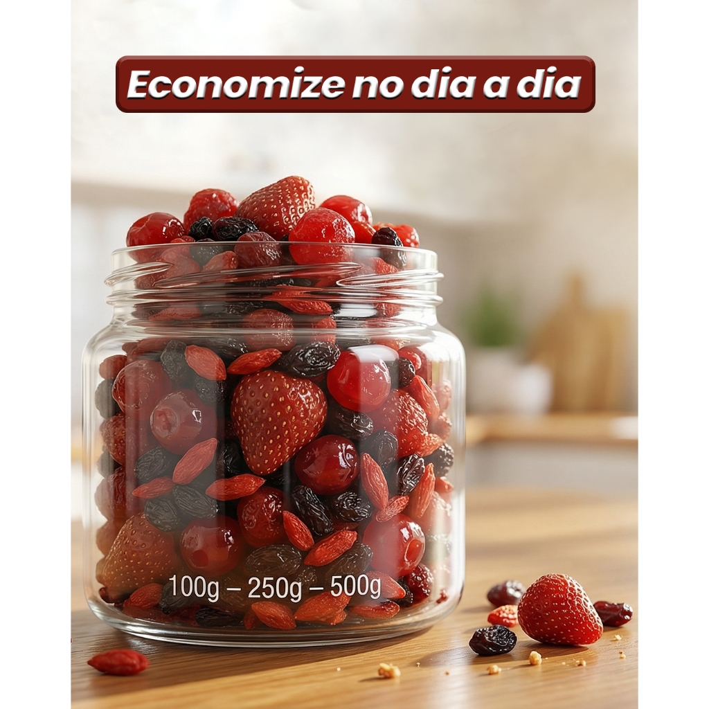 A opção ideal para quem busca qualidade + economia. Nosso mix de morango, cereja, cranberry, gojiberry e uva-passa desidratados pode ser usado em diversas receitas. ✨ Benefícios: Preço que cabe no bolso Ideal para manter na despensa Ótimo para lanches, receitas e snacks rápidos Ingredientes: Morango desidratado, cereja desidratada, cranberry desidratada, gojiberry desidratada, uva-passa.